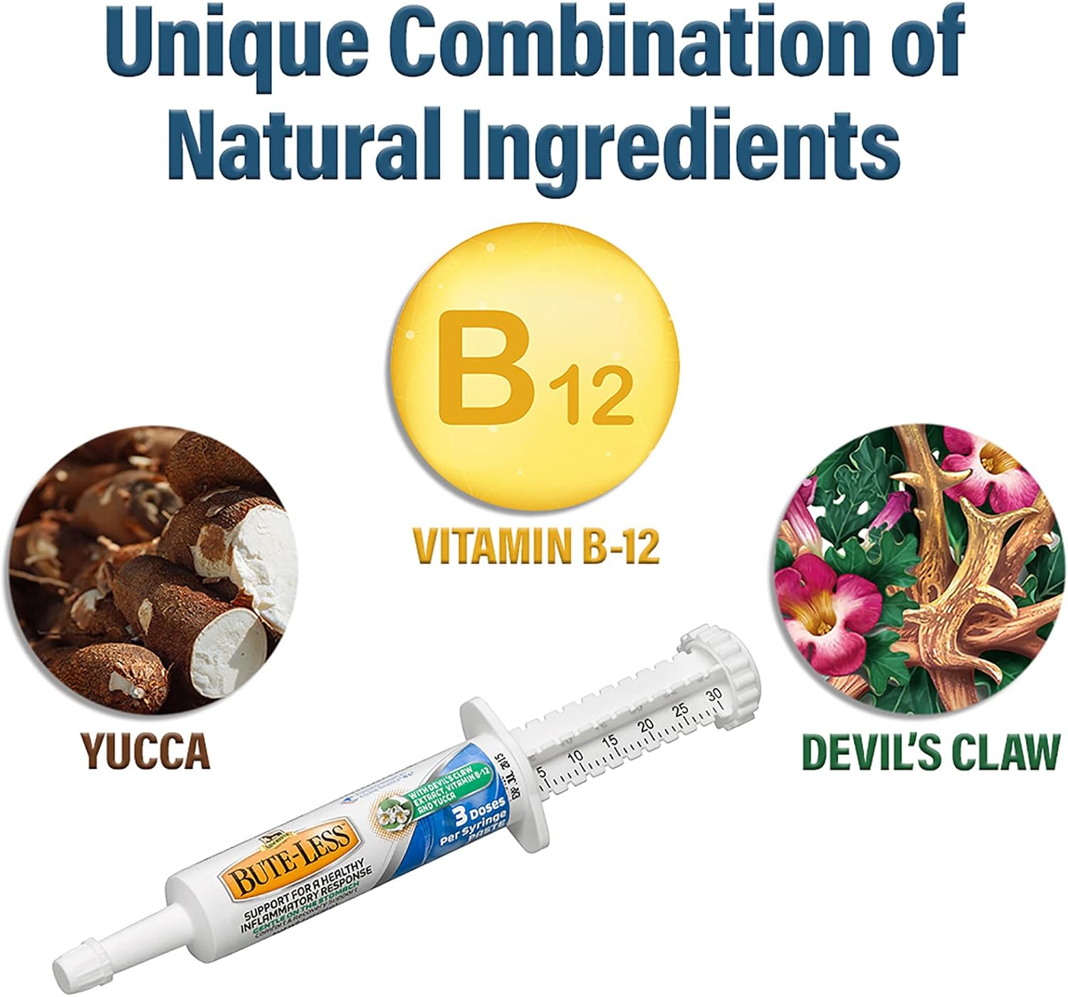 Absorbine Bute-Less Long-Term Horse Comfort & Recovery Supplement Paste, Gentle on Stomach, Devil’s Claw, Vitamin B-12, Yucca, 1oz Syringe / 3 Doses