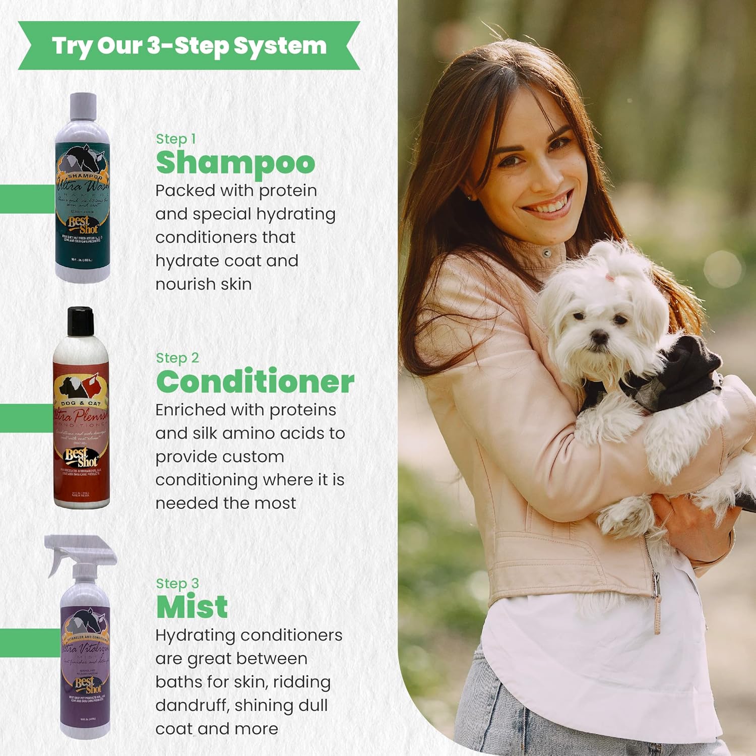 - Washes Off Easily: The pet grooming product for dogs, cats, and horses can dilute up to 2:1, washes off easily, and does not leave any residue behind. For best results, pair our Ultra-Vitalizing Mist with any Best Shot’s Pet shampoo and conditioner