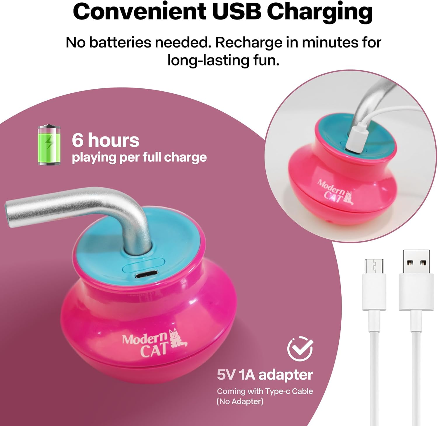 - USB Rechargeable – Built-in USB-C rechargeable battery powers up to 6 hours of continuous fun. Includes Type-C cable (no adapter); use any 5V 1A adapter for charging.