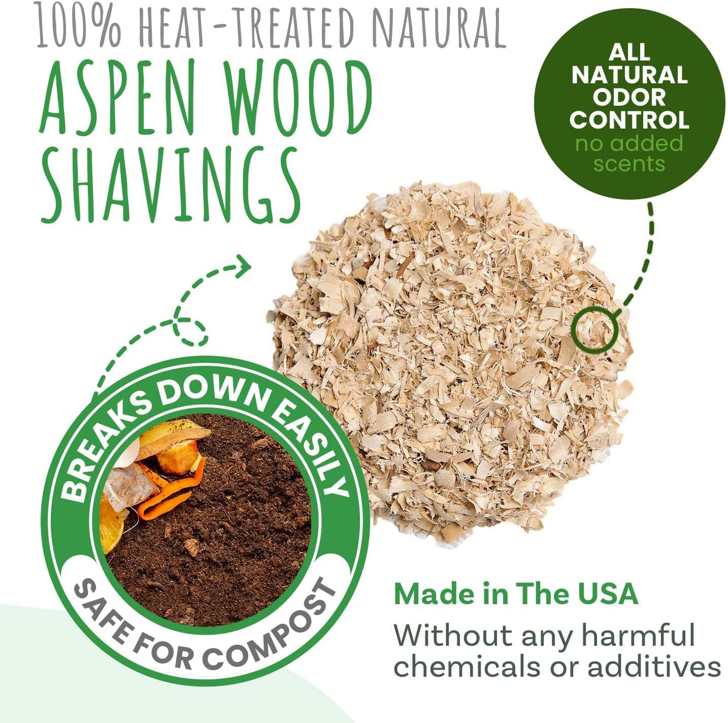 • 100% Heat-Dried All Natural Aspen Shavings: Made in the USA without any harmful dyes, chemicals or additives; Made from wood shavings directly off the tree - so no potentially dangerous fibers that may cause respiratory problems or other health issues; Breaks down easily and organically for safe disposal in your garden, compost, or organic waste bin