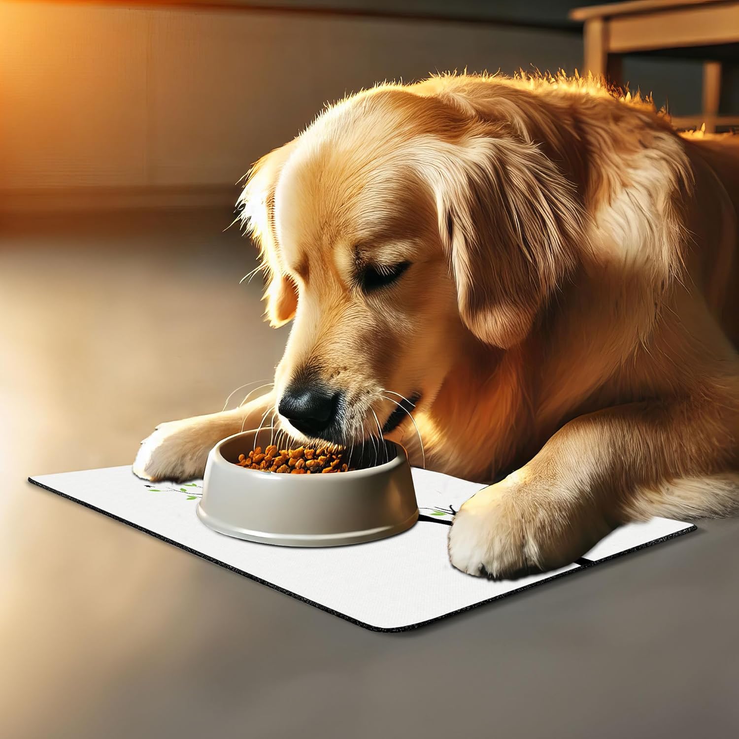 - Features - Fun prints and long-lasting colors. Find any theme and color you want to match your room decor or your pet’s personality. This pet feeding mat can even feature your cat's or dog’s favorite item or design, adding a cheerful touch to your pet’s feeding area.