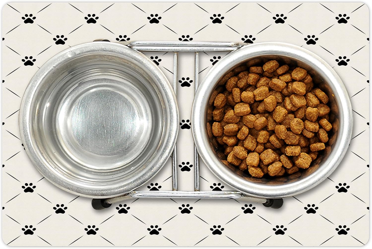 Lunarable Cat Pet Mat for Food and Water, Kitten Paw Footprints in Mirroring Marks Geometric Diamond Shapes Abstract Art Pattern, Non-Slip Rubber Mat for Dogs and Cats, 18" X 12", Beige Black