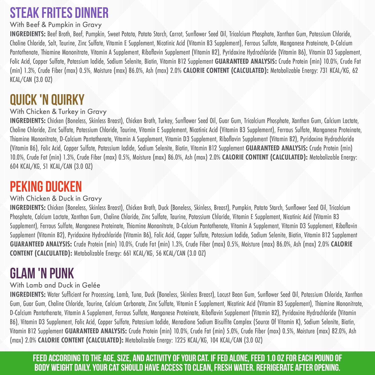 - Variety Pack includes 6 each of: Steak Frites, Peking Ducken, Quick & Quirky, and Glam & Punk