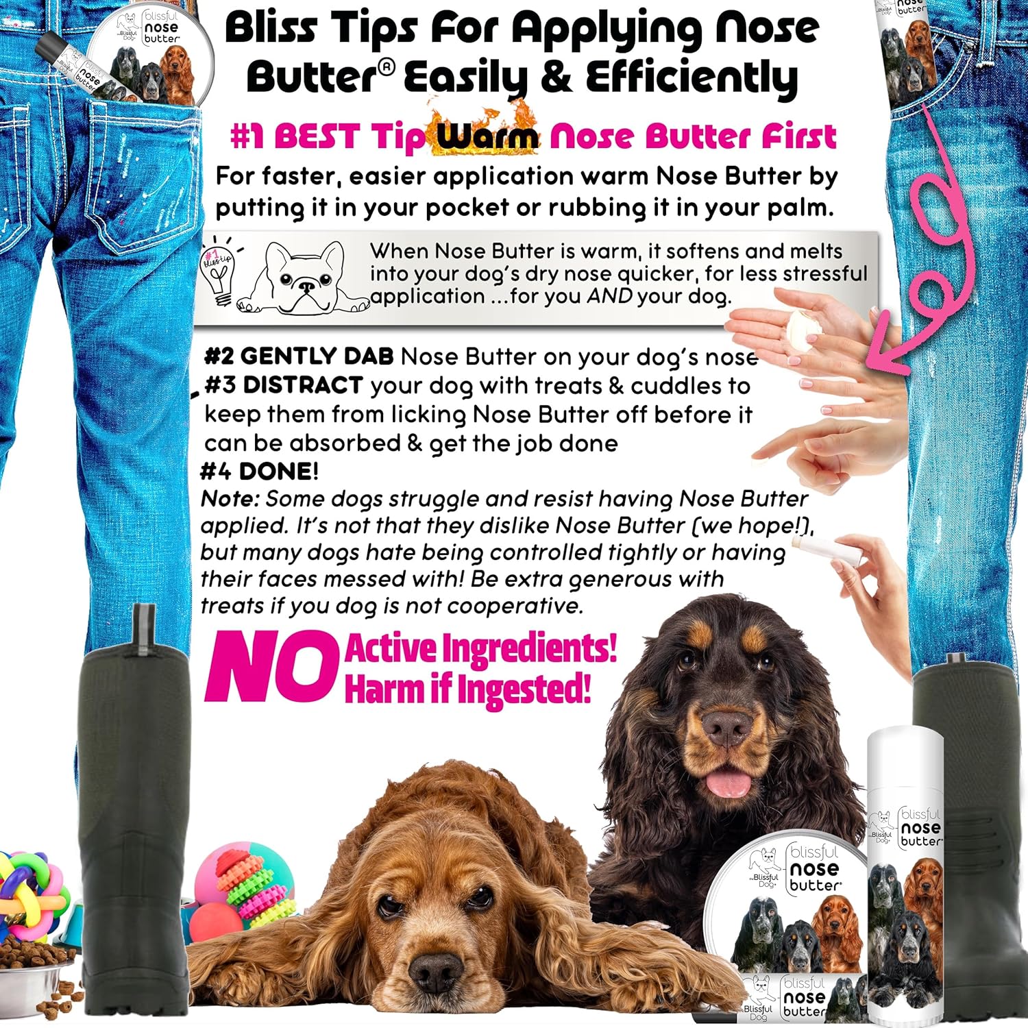 - Easy dog nose care - Easy to apply; Dab onto your dog's nose; that's it! Enriched with shea butter, this dog nose moisturizing butter brings relief to your dog’s dry nose. Non-toxic, no active ingredients, no harm if ingested