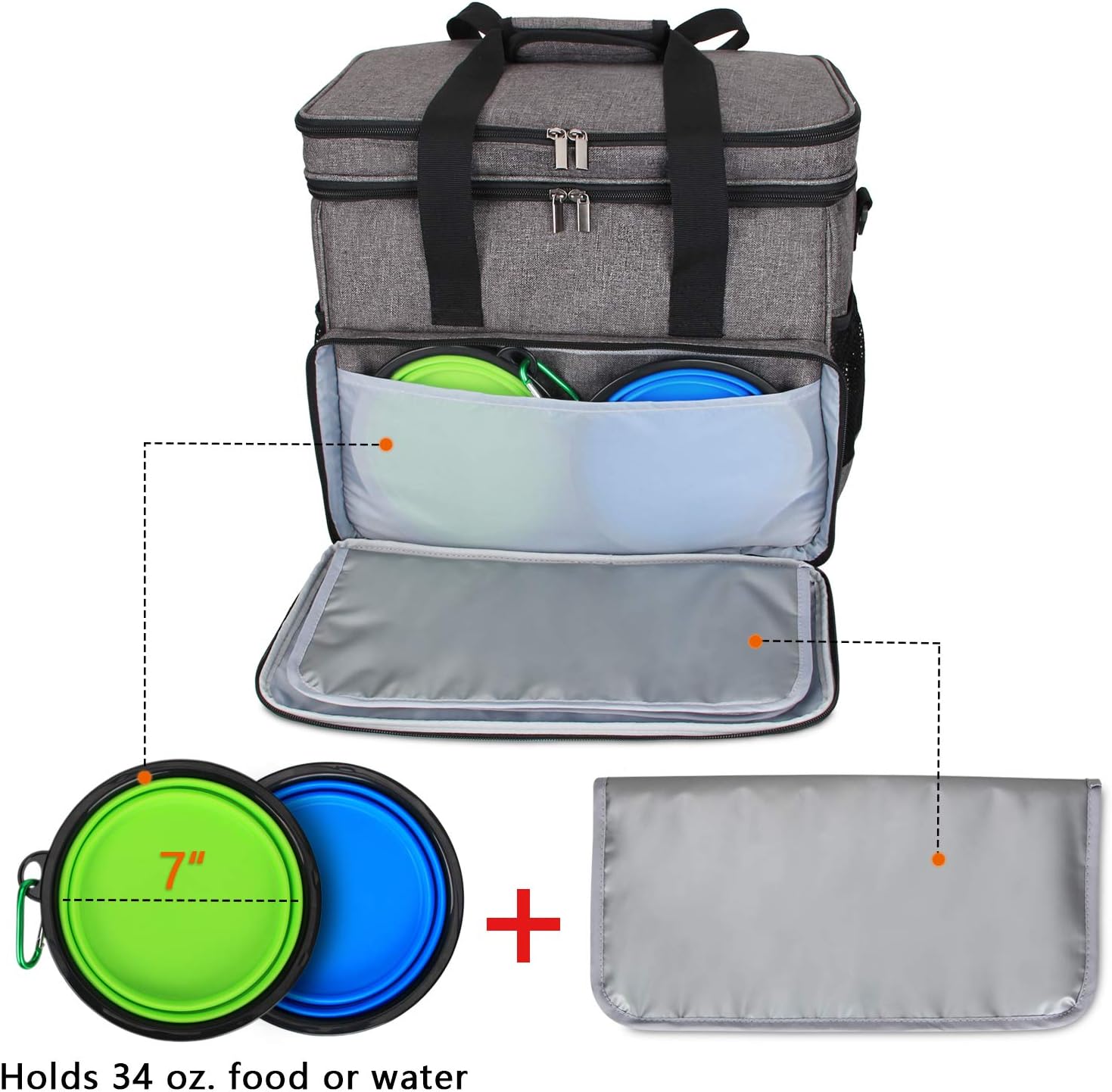 Teamoy Double Layer Dog Travel Bag, Dog Bag for Supplies with 2 Silicone Collapsible Bowls, 2 Food Carriers, 1 Water-Resistant Placemat, Pet Supplies Weekend Tote Organizer (Large, Gray)