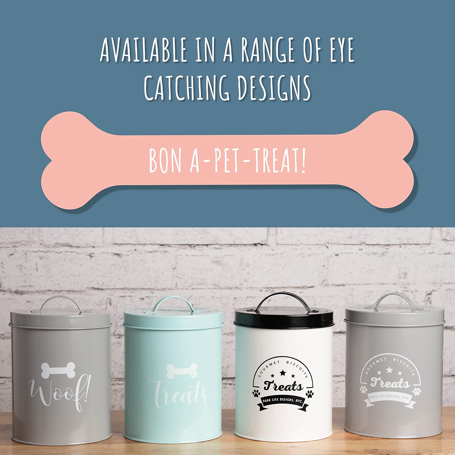 - PREMIUM QUALITY: Beautifully crafted from carbon steel and brightens up any counter space. A decorative designer treat canister for our furry friends to express themselves!