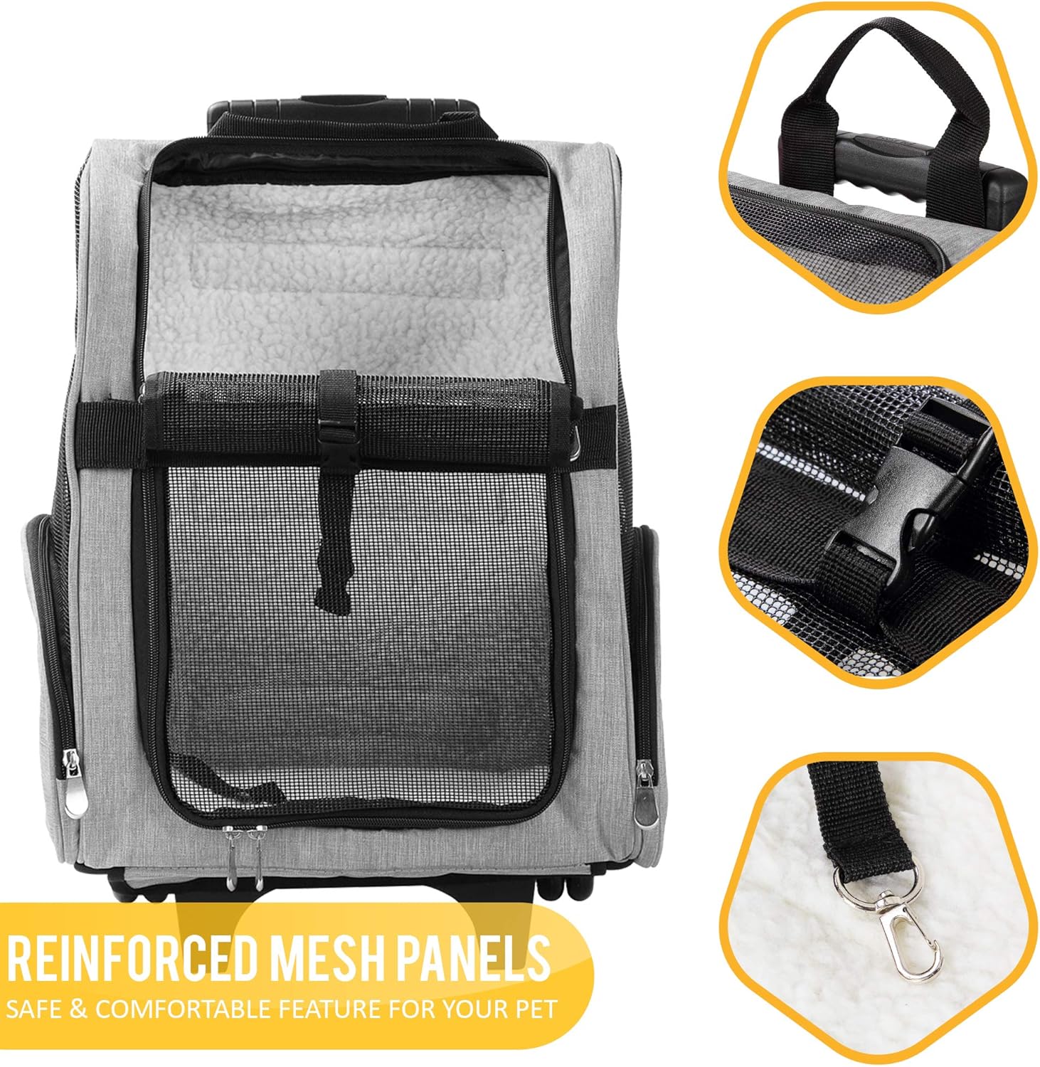 - ✔️3 different ways to carry - telescoping handle, strap handle and Backpack straps provide 3 Easy and convenient carrying solutions for different everyday needs. Lots of storage - 2 large pockets are perfect for safely storing the stuff your pet can never be without.