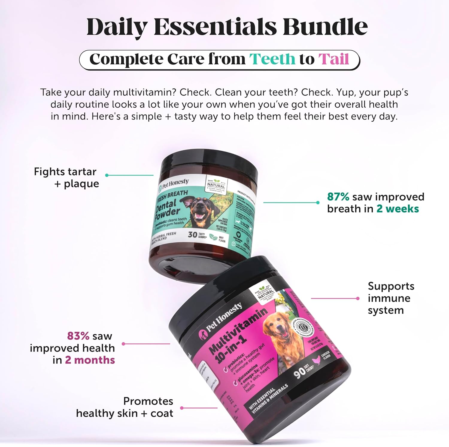 - 10 Benefits in 1 Daily Chew - Our 10 in1 Multivitamin chews combine a well-rounded blend of essential vitamins and supplements for dogs' overall daily health including glucosamine, probiotics, vitamins, and omegas. Vitamins A, C, and D3 have antioxidant properties that help improve your dog's immune system and keep their heart strong and healthy.