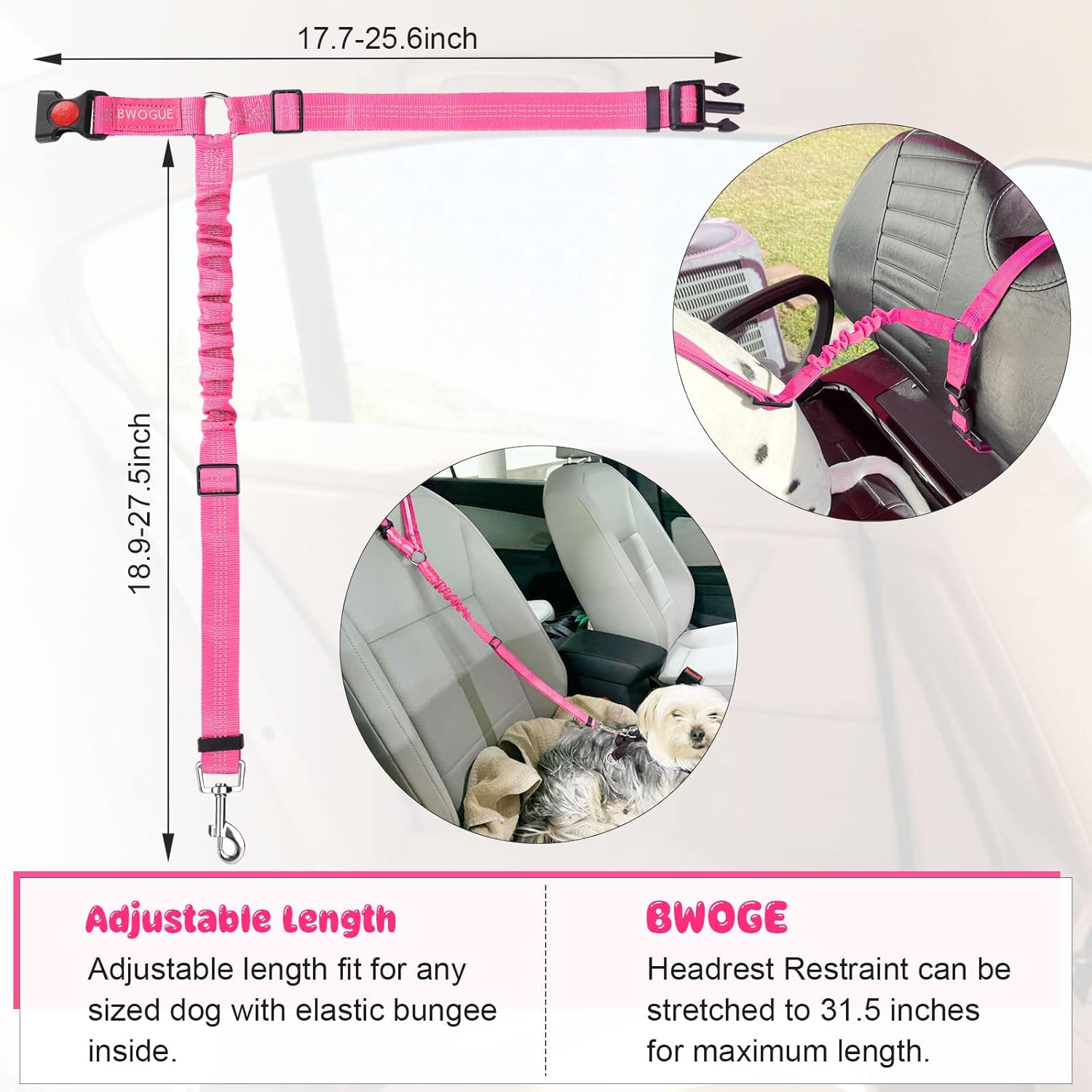 - ADJUSTABLE LENGTH: Dogs come in different sizes and weights. With buckle on the straps and the elastic bungee inside, The BWOGE Headrest Restraint is adjustable between 18.9-27.5 inches and can be stretched to 31.5 inches for the maximum length. The circle can be adjusted from 17.7 inches to 25.6 inches.You can easy to adjust the dog leash to the suitable length to keep your pet in a safety state.