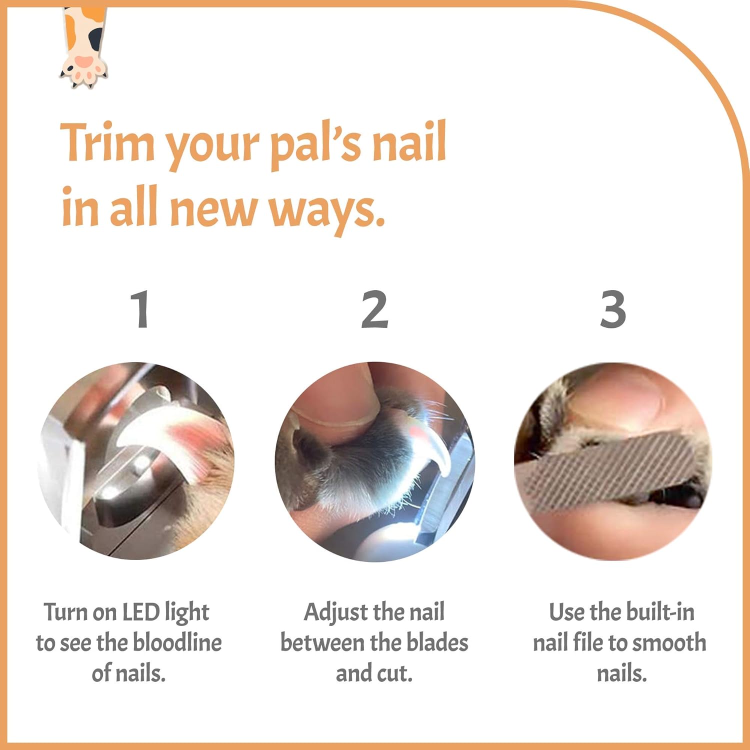 - ๐๐๐ ๐๐ข๐ ๐ก๐ญ: LED light powered by rechargeable battery illuminates the bloodline in nails and claws for easier and safer cutting experience! Note: LED light may have less illumination effects on dark and black nails.