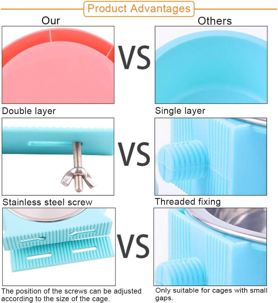 - Hanging Cage Design: The corrugated design locks the cage bars securely and is not easy to fall off. Removable stainless steel inner bowl with smooth surface, easy to clean.