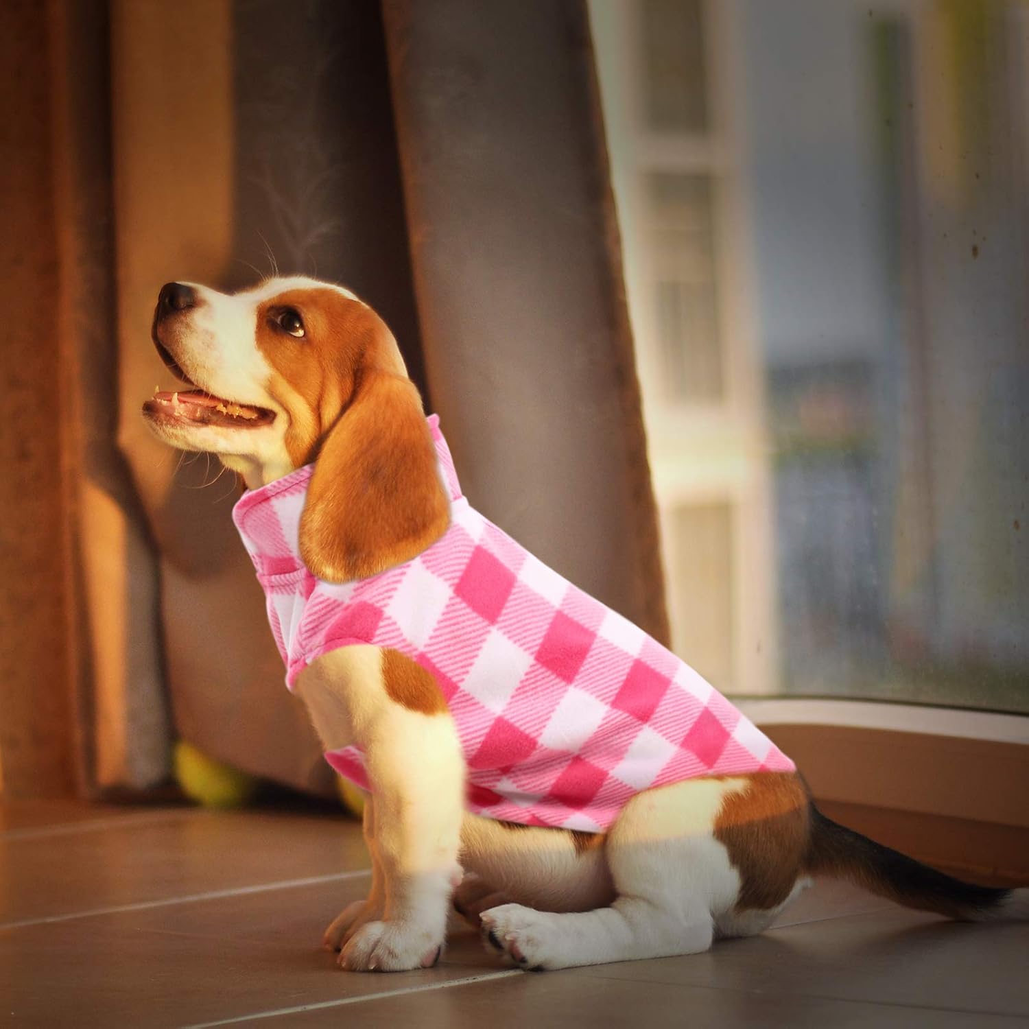 ASENKU Dog Sweater, Plaid Dogs Fleece Vest, Soft Comfortable Pet Pajamas, Warm Winter Puppy Shirt, Cold Weather Coat Jacket Pet Clothes for Small & Medium Dog Breeds, Pink, L