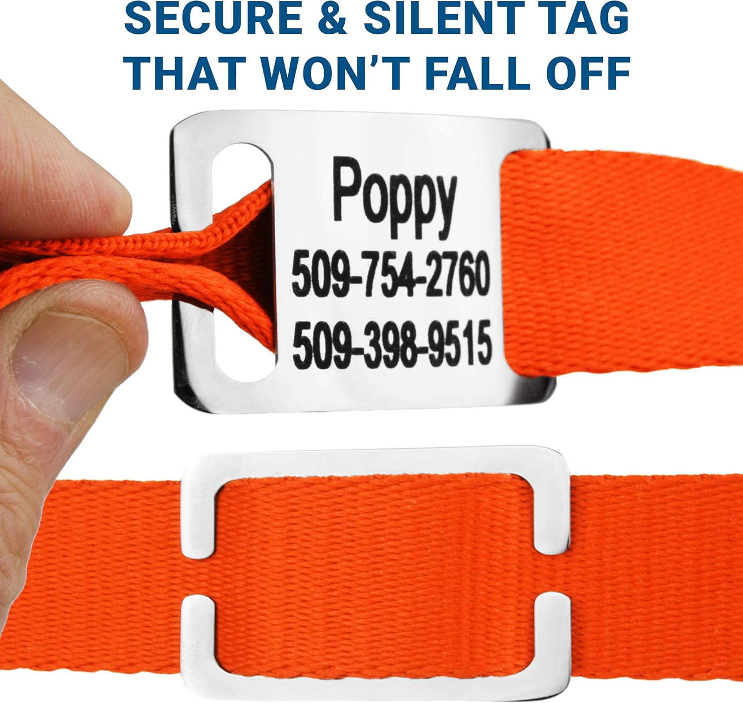 GoTags Personalized Dog Collar with Nameplate, Adjustable Dog Collar with Custom Engraved Slide On Pet ID Tag in Stainless Steel, Silent, No Noise Dog Tag for Large Medium and Small (Orange, Small)