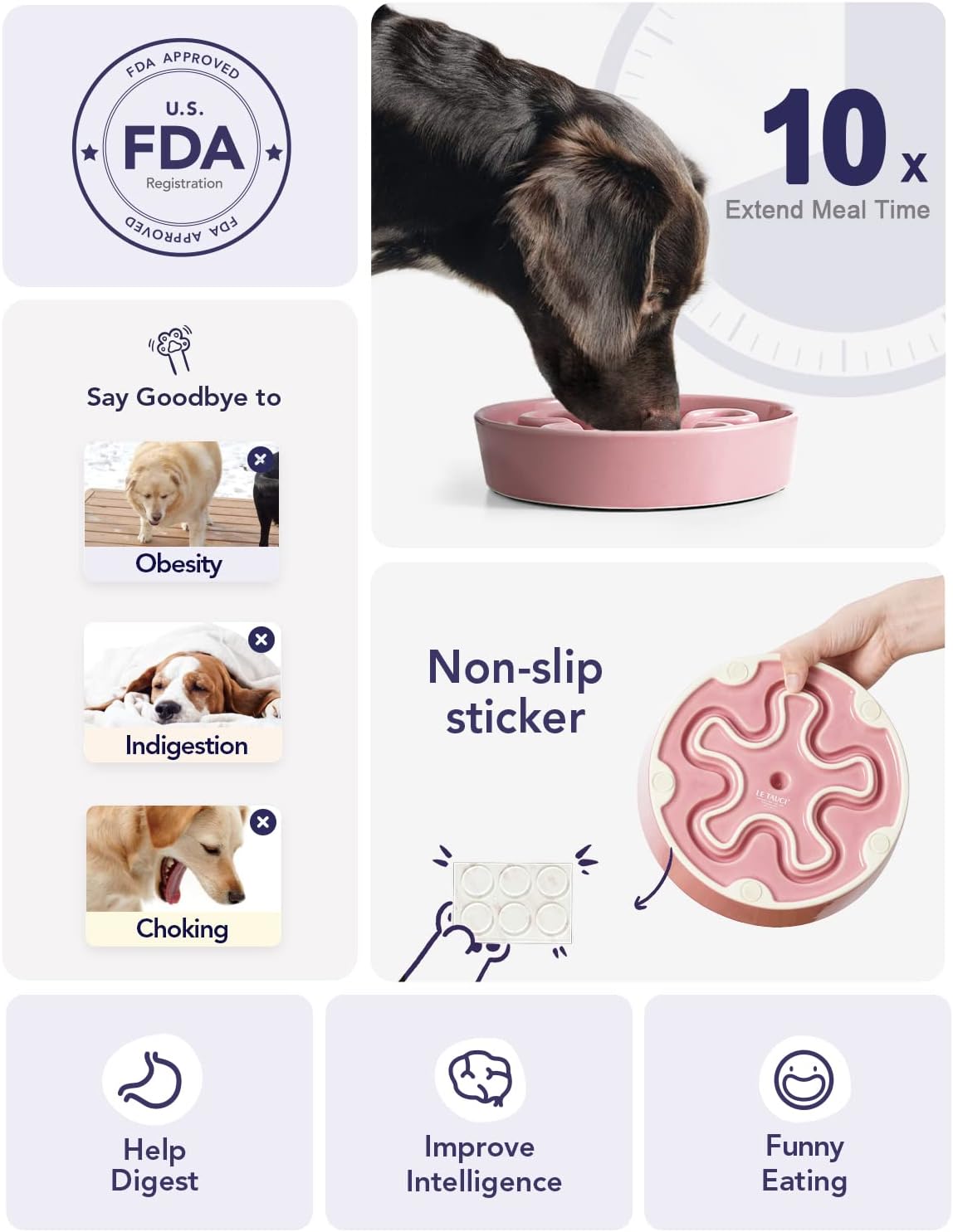 - Slow Down Eating, Bring Dog A Healthy Diet: Fast-eating dogs experience bloat, regurgitation, and obesity easily. Our slow feeder dog bowl design with the ridges and maze pattern helps your dog to eat slower than 10 times. Your dog could change his overeating behavior through a challenge and fun mealtime