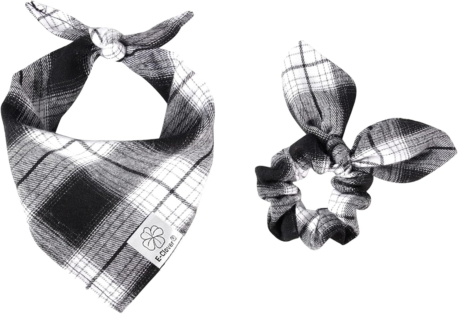 E-Clover Plaid Dog Scarf & Matching Scrunchie Set - Triangle Pet Bandana Bibs for Small Dog Puppy Owner Birthday Gifts - Black & White