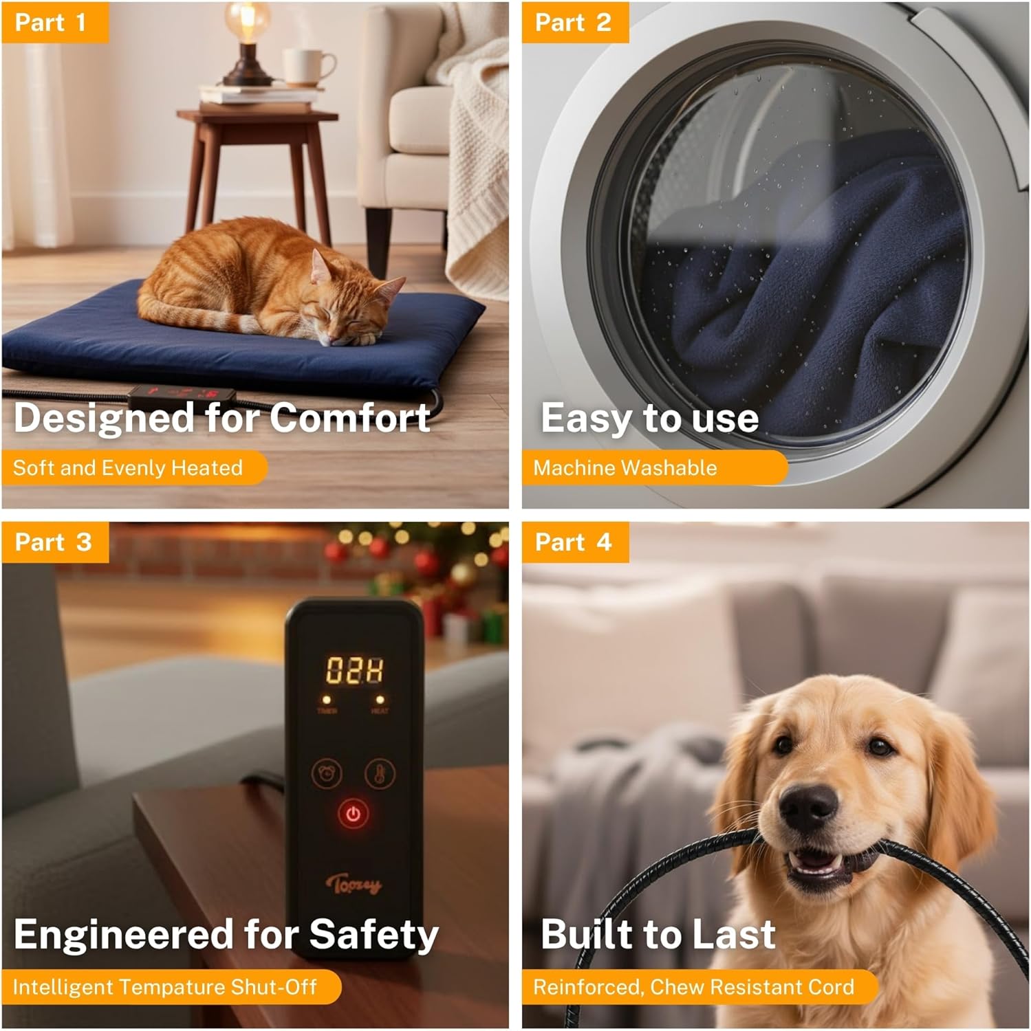 - ❤【Pet Heating Pad with Timer】The electric pads for cats with timer function provide auto shut-off range from 2 to 24 hours, conserve energy and prevent burns caused by excessive heating. The timer LED will be shifted down one level to tell you how much time is left.
