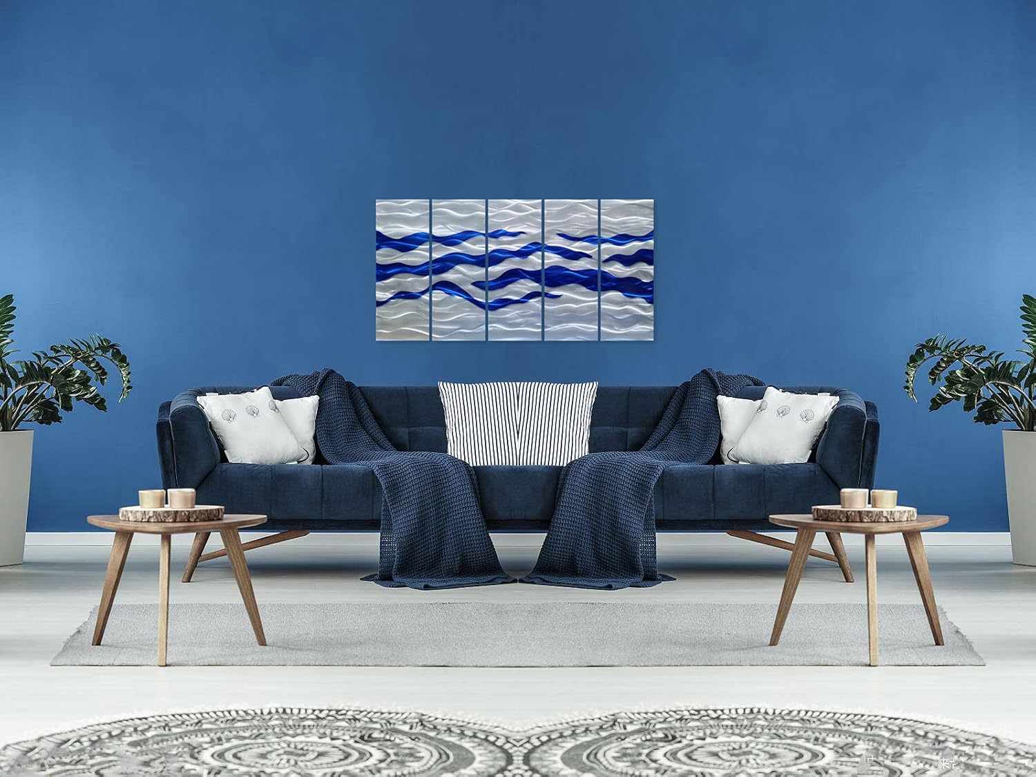 SYGALLERIER Abstract Coastal Metal Wall Art Handcrafted Big 3D Blue and Silver Artwork Modern Sea Waves Pictures Contemporary Sculpture for Living Room Bedroom Bathroom Decor