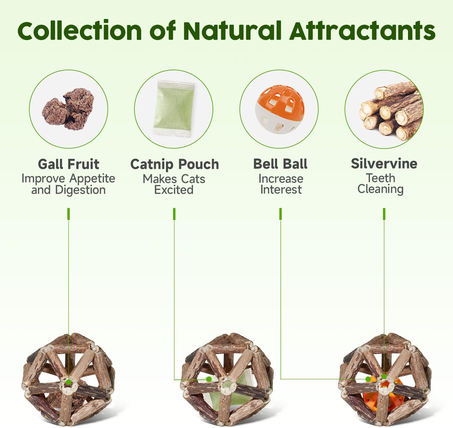 - 【Promote Digestion】Catnip and silvervine contain rich dietary fiber, which promote gastrointestinal motility, help get rid of hairballs and improve digestion. If your cats lose interest after playing for some time, you can cut off the exterior of silvervine sticks to intensify aroma, making the balls as appealing as new toys