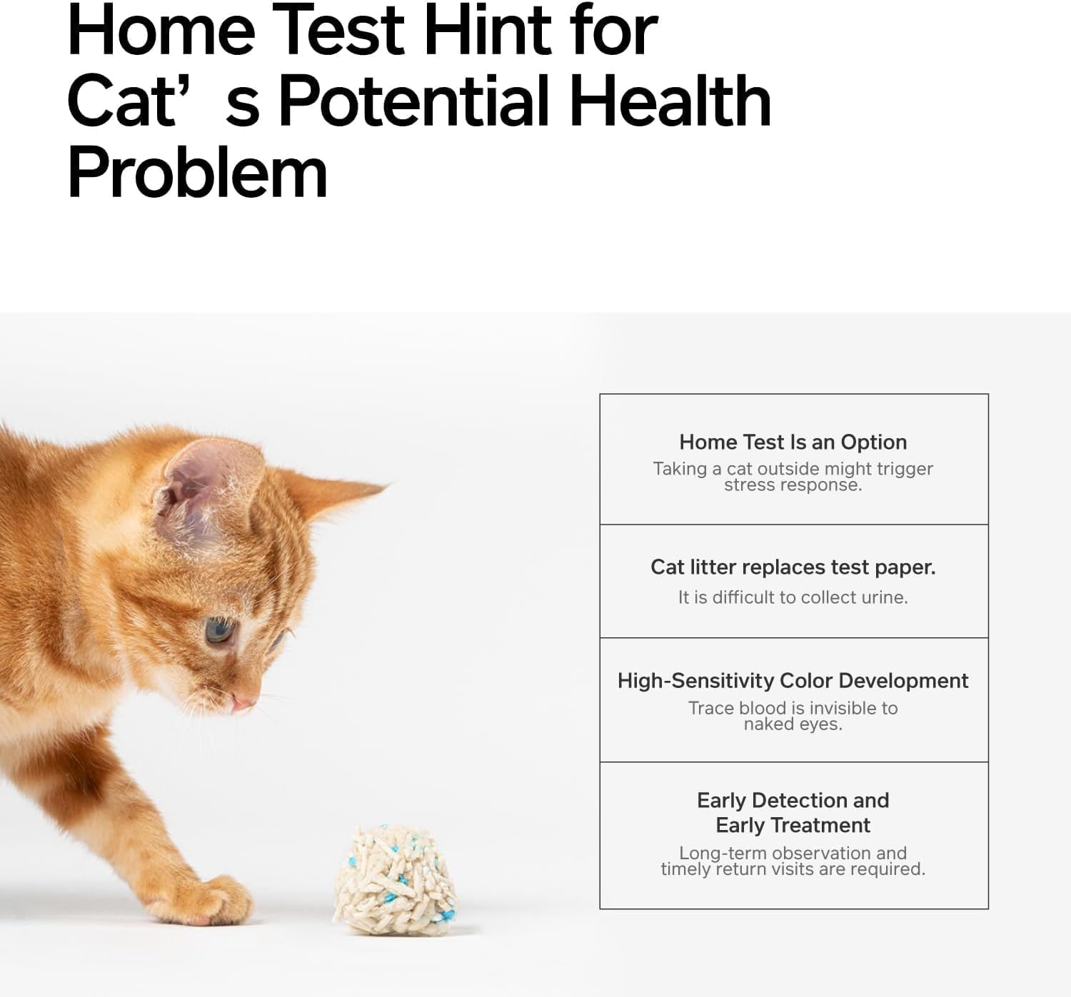- 【Attention】 1.Direct exposure to hard light or friction with metal would invalid the detection function of the occult blood test particles. Please avoid such situations.2.Mineral substance contained in bentonite would affect the detection performance. Do NOT mix the product with other cat litter. 3.The vacuum design is only to facilitate its transportation and storage, and air leakage does NOT compromise the use. If you DO mind, please contact us.