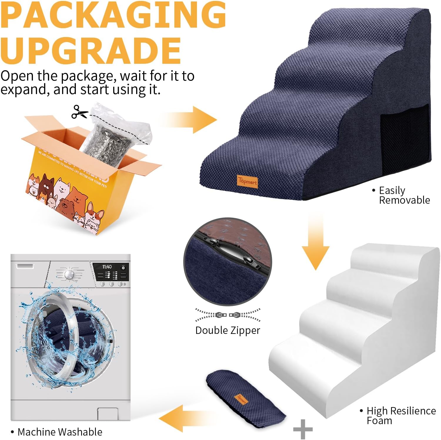 - High Quality Sponge: Made of 30D high-density sponge, strong resilience, not easy to deformation, very durable. Soft sponge provides a very comfortable touch to the pet. Even if the pet runs and plays or human accidentally hit the Topmart dog stairs will not be injured.