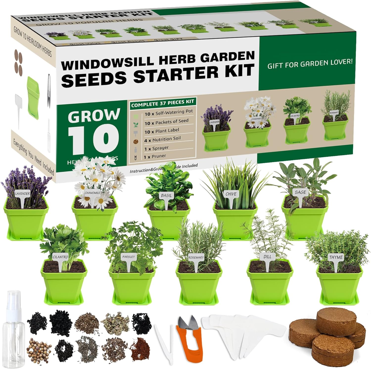 - MEET ALL NEEDS FOR HERB GROWING: Package comes with 10 types of herb seeds, 10 pots, 10 plant markers, 4 nutritional soil discs, 1 water bottle, 1 mini metal pruner, and an instruction & growing guide. The herb grow kit is super simple and easy to use, perfect for garden beginners.