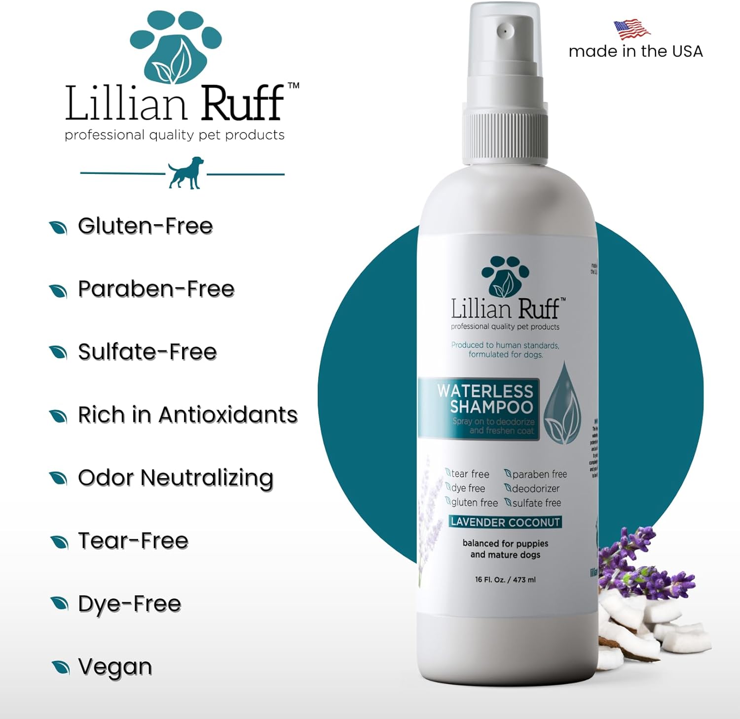 Lillian Ruff Waterless No-Rinse Dog Dry Shampoo Spray with Hydrating Essential Oils - pH-Balanced Dry Shampoo for Dogs - Clean, Condition, Detangle & Deodorize Dry, Sensitive Skin (Lavender Coconut)