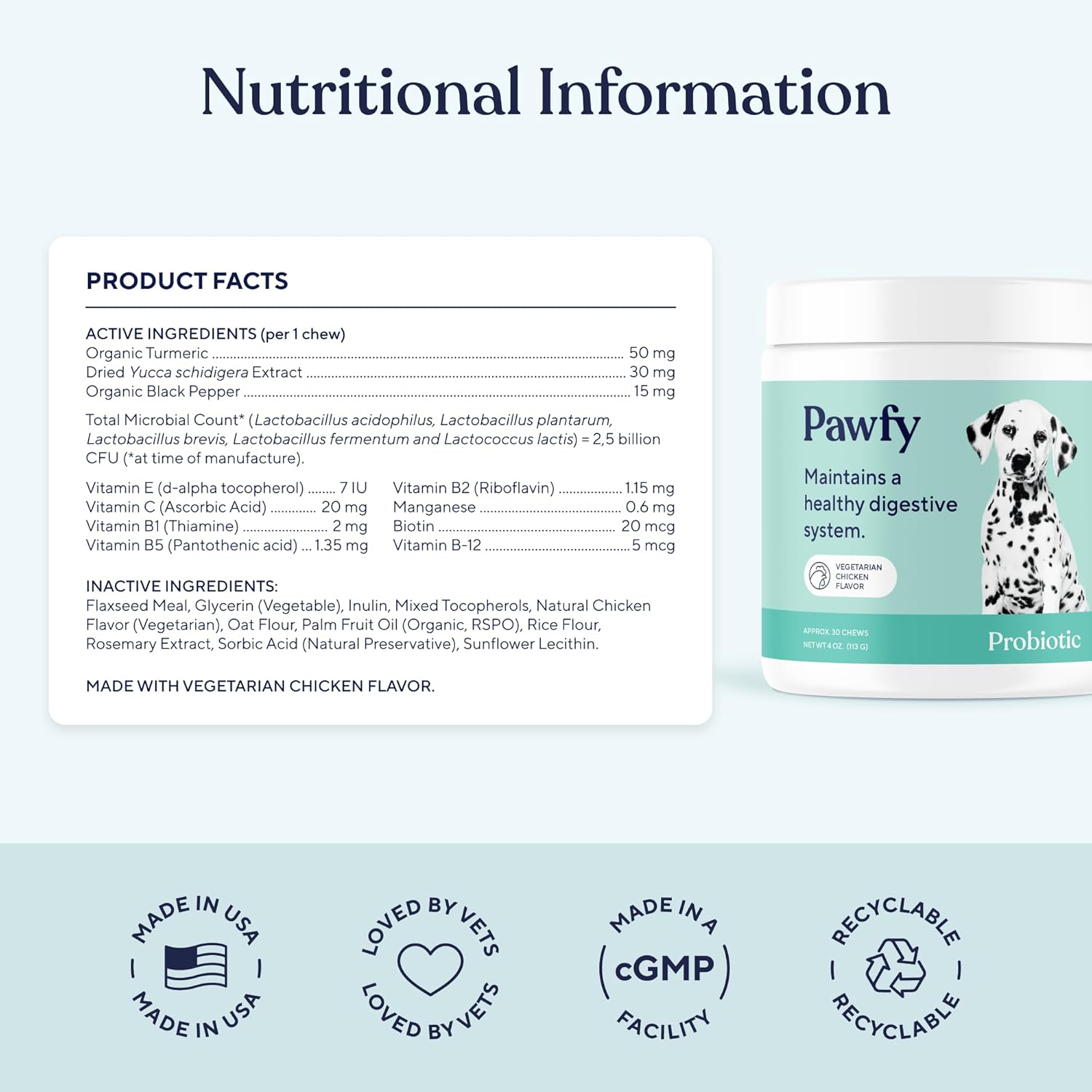 - Easy and Enjoyable Supplementation: Pawfy Probiotic Dog Chews are flavorful and convenient, making it simple to support your dog’s health without the hassle of pills or powders. Loved by dogs, these chews turn supplementation into a stress-free experience