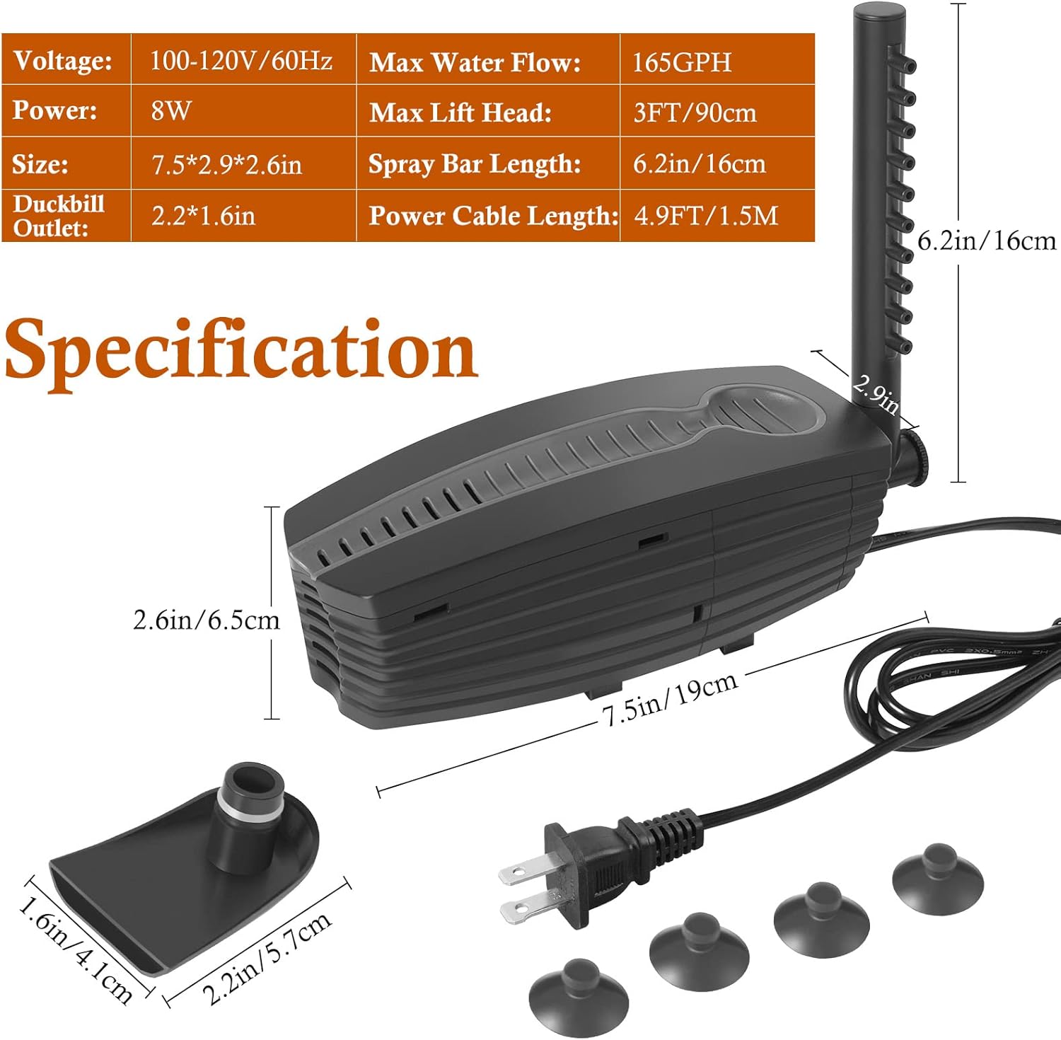 - 【Specifications】Powerful aquarium internal filter, Power: 8W, Max Water Flow: 165GPH, Size: 7.5*2.9*2.6in, Spray Bar Length: 6.2in/16cm, Power Cable Length: 4.9FT. Suitable for 10-50gallon fish and turtle tank.
