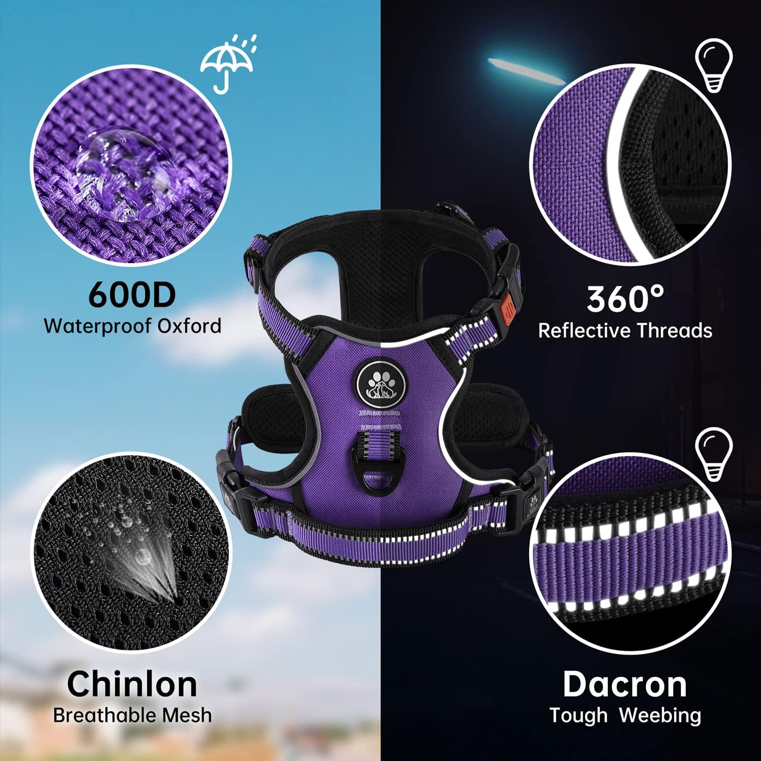NESTROAD No Pull Dog Harness,Adjustable Oxford Dog Vest Harness with Leash,Reflective No-Choke Pet Harness with Easy Control Soft Handle for Small Medium Dogs(Medium,Purple)