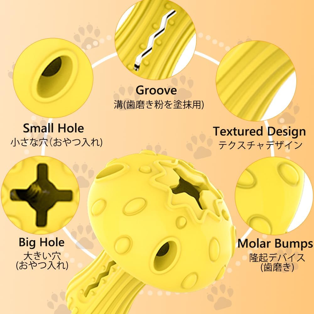 - Teeth Cleaning Toy: There are ridges and bumps on the surface of the mushroom doggy toy and a groove in the stem where you can insert jerky or apply dog toothpaste or peanut butter. It attracts dogs’ interest and helps them clean teeth while teething.