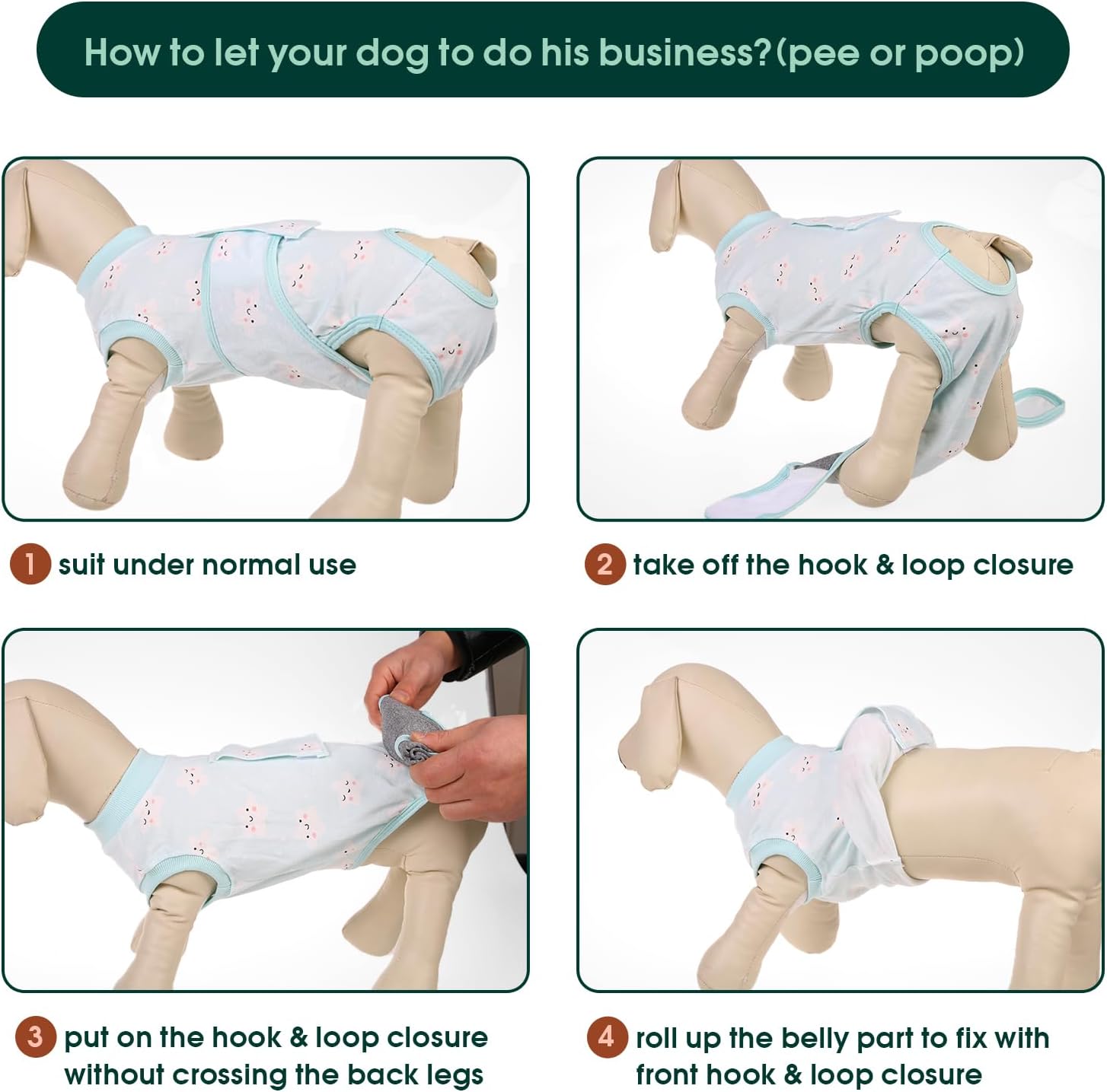 - Easy to Wear: When your dog needs a bathroom break, remove and secure the tapes with provided instructions, aiding wound recovery. Made from machine-washable materials, it's completely safe for your pet