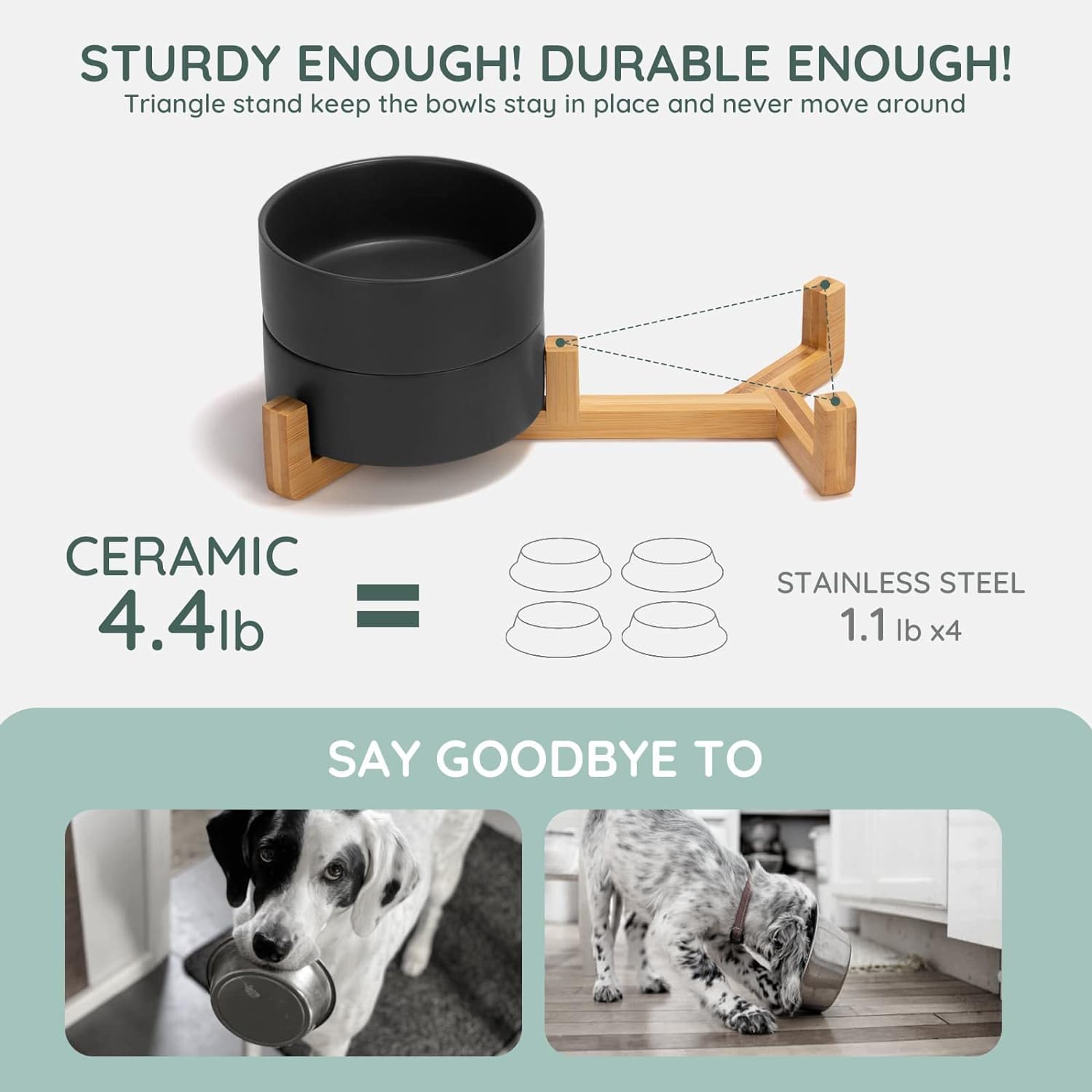 - [Natural Wooden Stand]:Unique wooden stand can effectively prevent food from spilling and keep the floor clean and tidy. Non-Slip bowl base, making it easy to pick up and put down