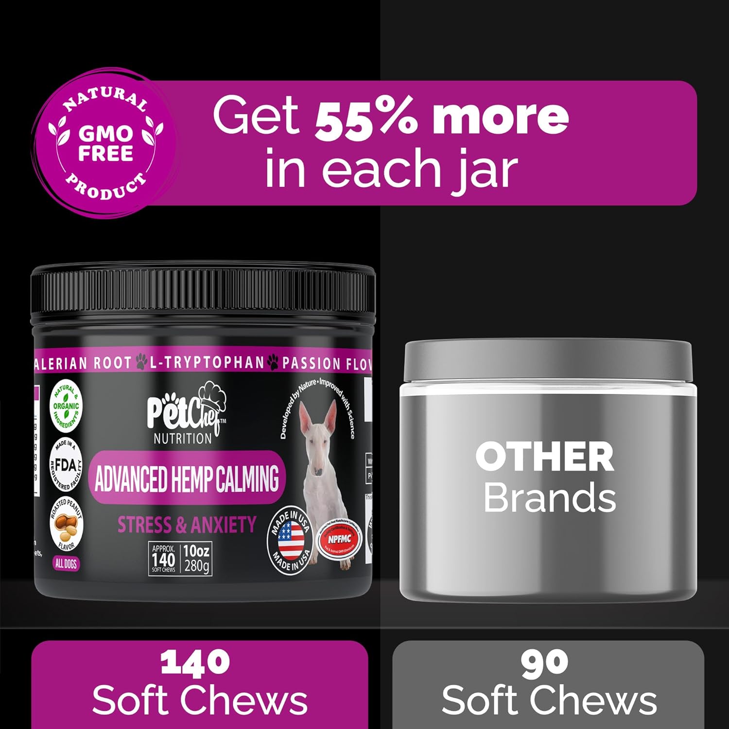 Pet Chef Dog Calming Chews 140 Ct - Hemp Calming Treats for Dogs Anxiety Relief - Natural Chews for Separation Anxiety, Stress & Pain - Peanut Butter Flavor - USA Made Calming Bites