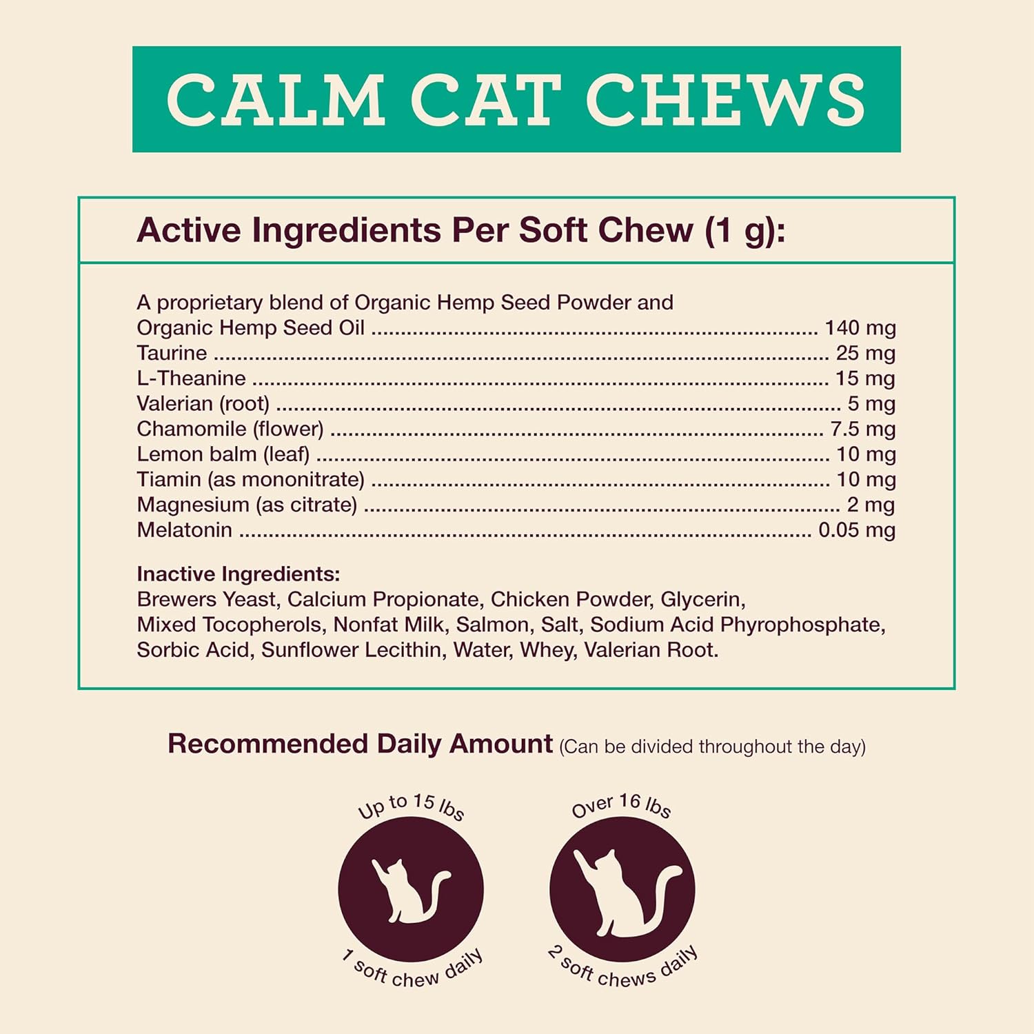 - With organic ingredients like chamomile, melatonin, and hemp, these soft chews offer anti anxiety for cats. Hemp Well promotes a calm cat demeanor that you and your cat will love.