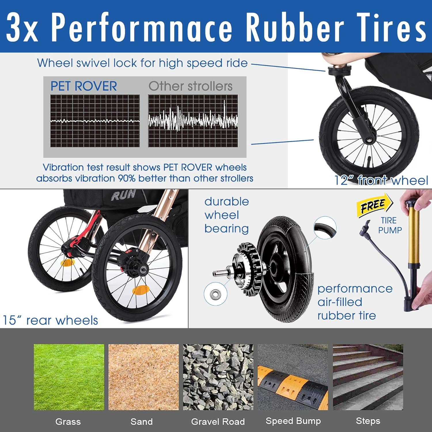 - 3X PERFORMACE RUBBER WHEELS β All three durable and durable automotive-grade air filled rubber tires offer excellent stability and superior ride quality for speedy travel on all terrains. Highly maneuverable front swivel wheel with swivel locks of the front wheel enhances stability even on rough terrains. The oversized rear wheels add comfort and stability for jogging and running. A free tire pump is included