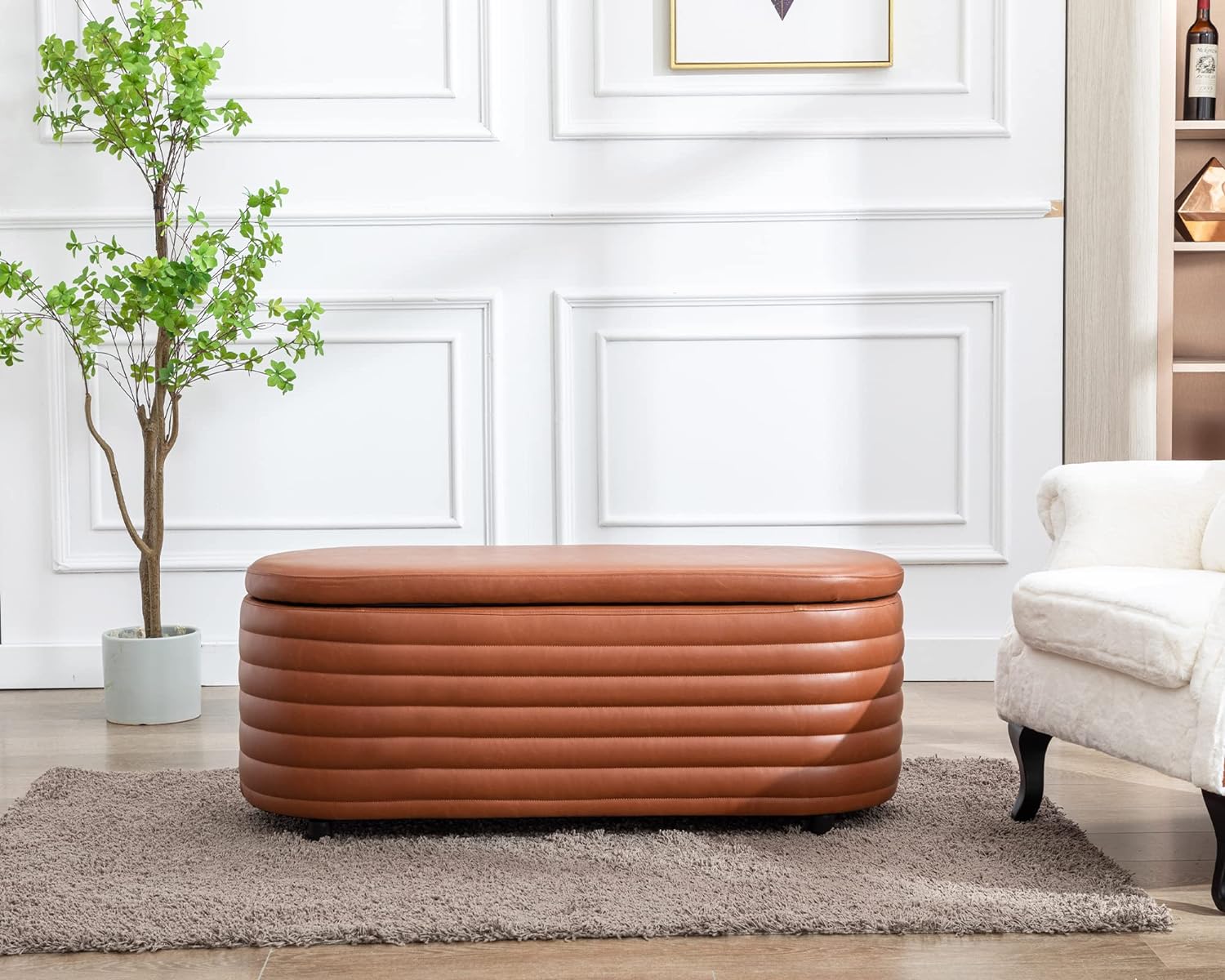Storage Ottoman Bench Upholstered PU Leather End of Bed Stool with Safety Hinge for Bedroom, Living Room, Entryway (44.5-inch, Brown), TN2436