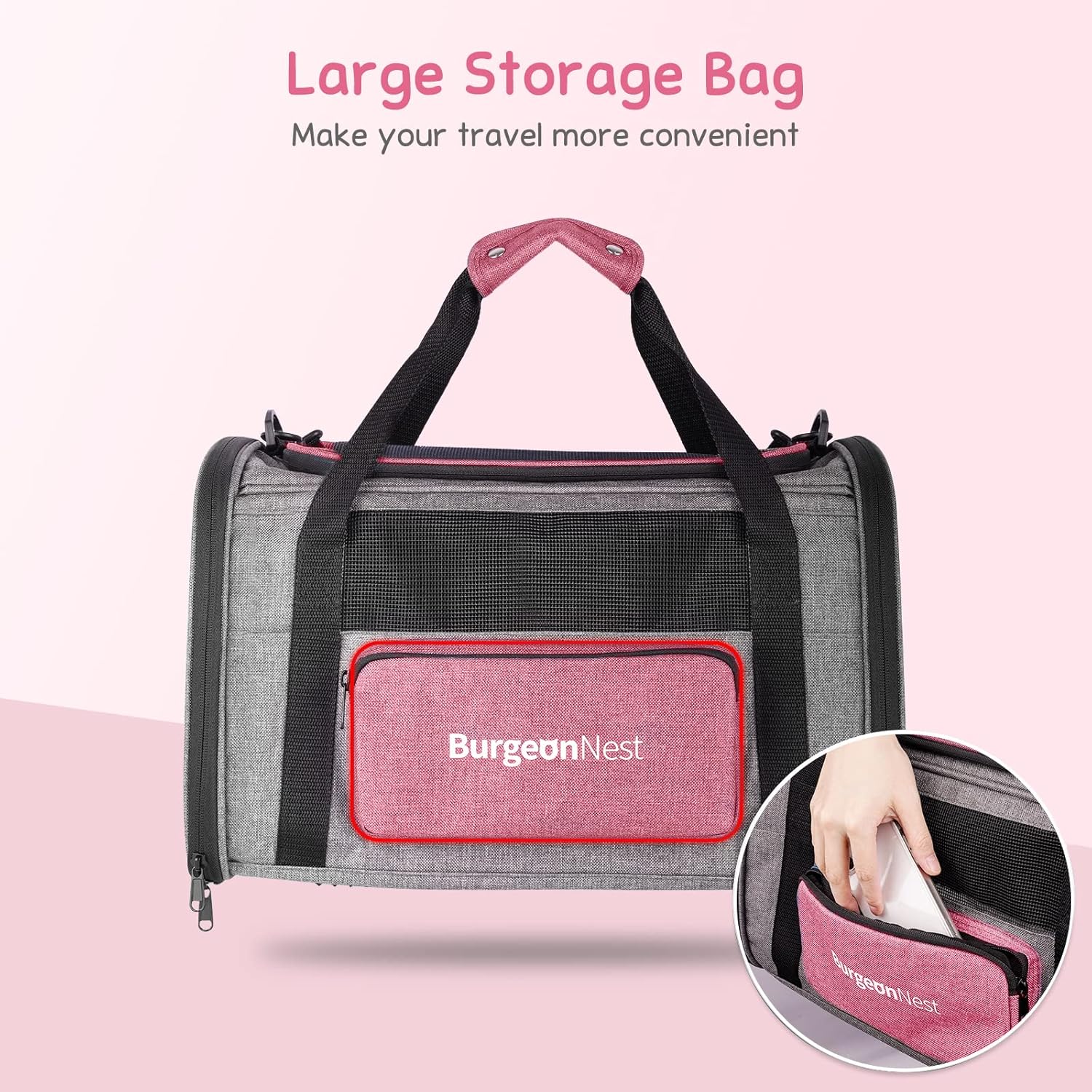 • Large Unique Side Bag: Storage bag is bright-pink, very fashional collapsible cat carrier. Break the dullness! Bag on the side can hold garbage bags, food or folding bowl for your pets.