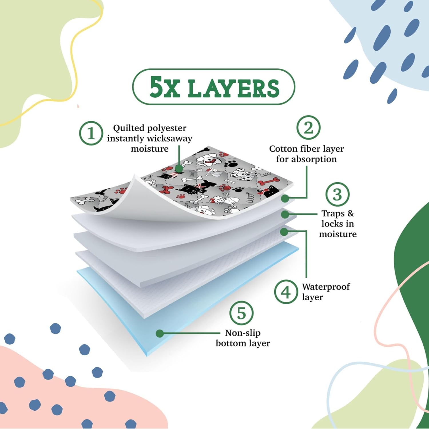 - Highly Absorbent: Our 5 layer washable puppy pads are soft and highly absorbent. Perfect as wee wee pads for dogs, reusable dog training pads, and reusable dog pee pads.