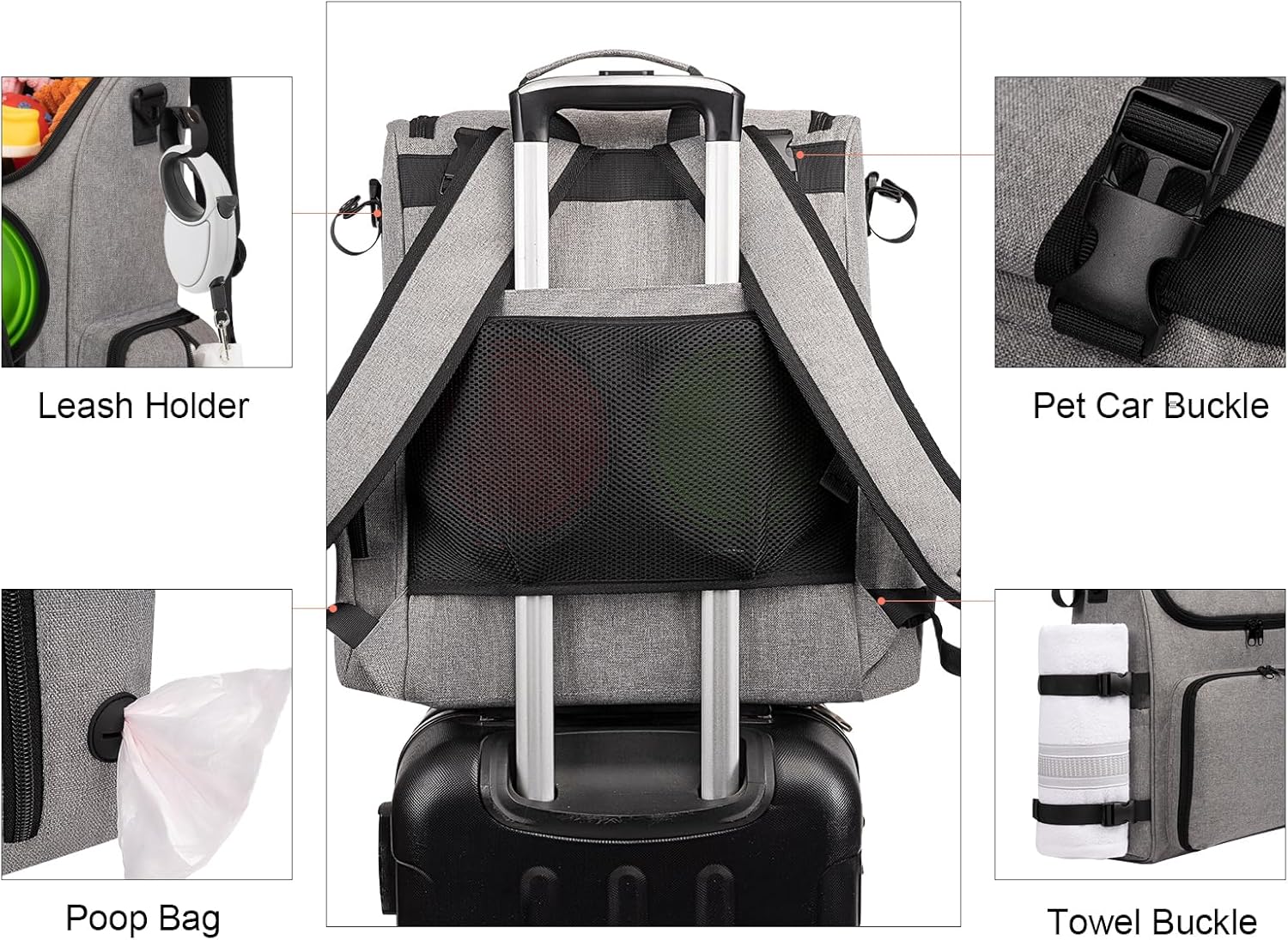 Modoker Dog Travel Bag Backpack, Airline Approved Pet Accessories Organizer for Dog and Cat with Shoulder Strap, 2 Dog Food Storage Containers, 2 Collapsible Dog Bowls,1 Pet Mat, Grey