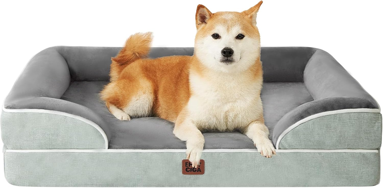 EHEYCIGA Orthopedic Dog Beds for Large Dogs, Waterproof Memory Foam Large Pet Bed with Sides, Non-Slip Bottom and Egg-Crate Foam Dog Couch Bed with Washable Removable Cover, Greyish Green