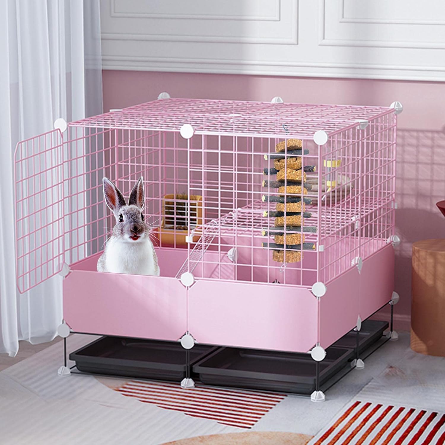 - HANGING RABBIT CHEW TOYS:Bunny chew toys hanging consist of 8 carrot love cakes and 7 apple sticks,Guinea pig hanging chew toys can give your pet the double pleasure of chewing and playing