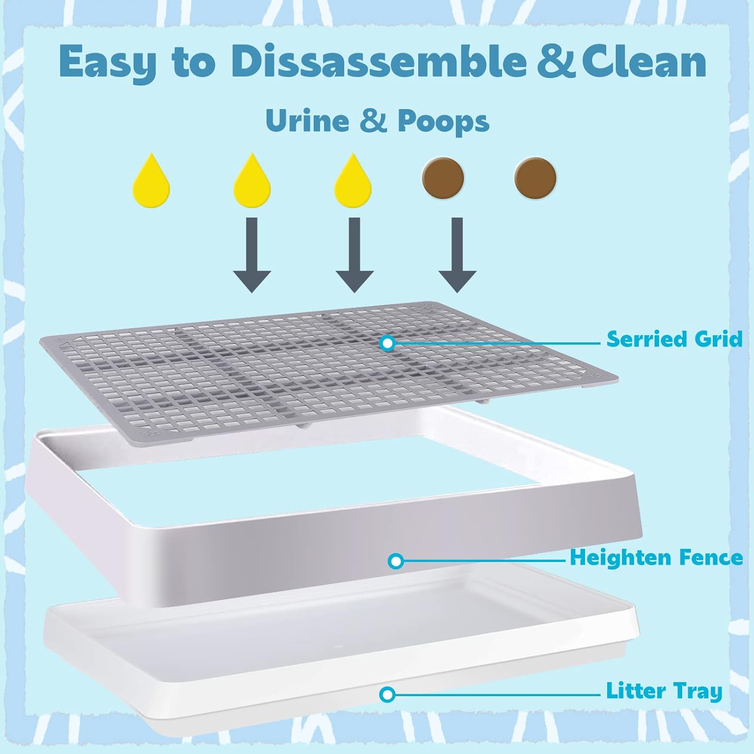 • Guinea Pig Toilet in Grid Design: The right size mesh of 0.39 x 0.39 inches ensures that the pet's feet won't get stuck in the rat litter box; And the serried mesh also enables the excrement and pee to be fully exhaust to the hamster litter box bottom,avoid getting their feet dirty and unhygienic things cause illness