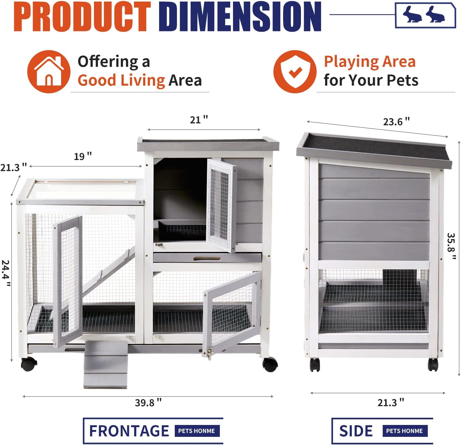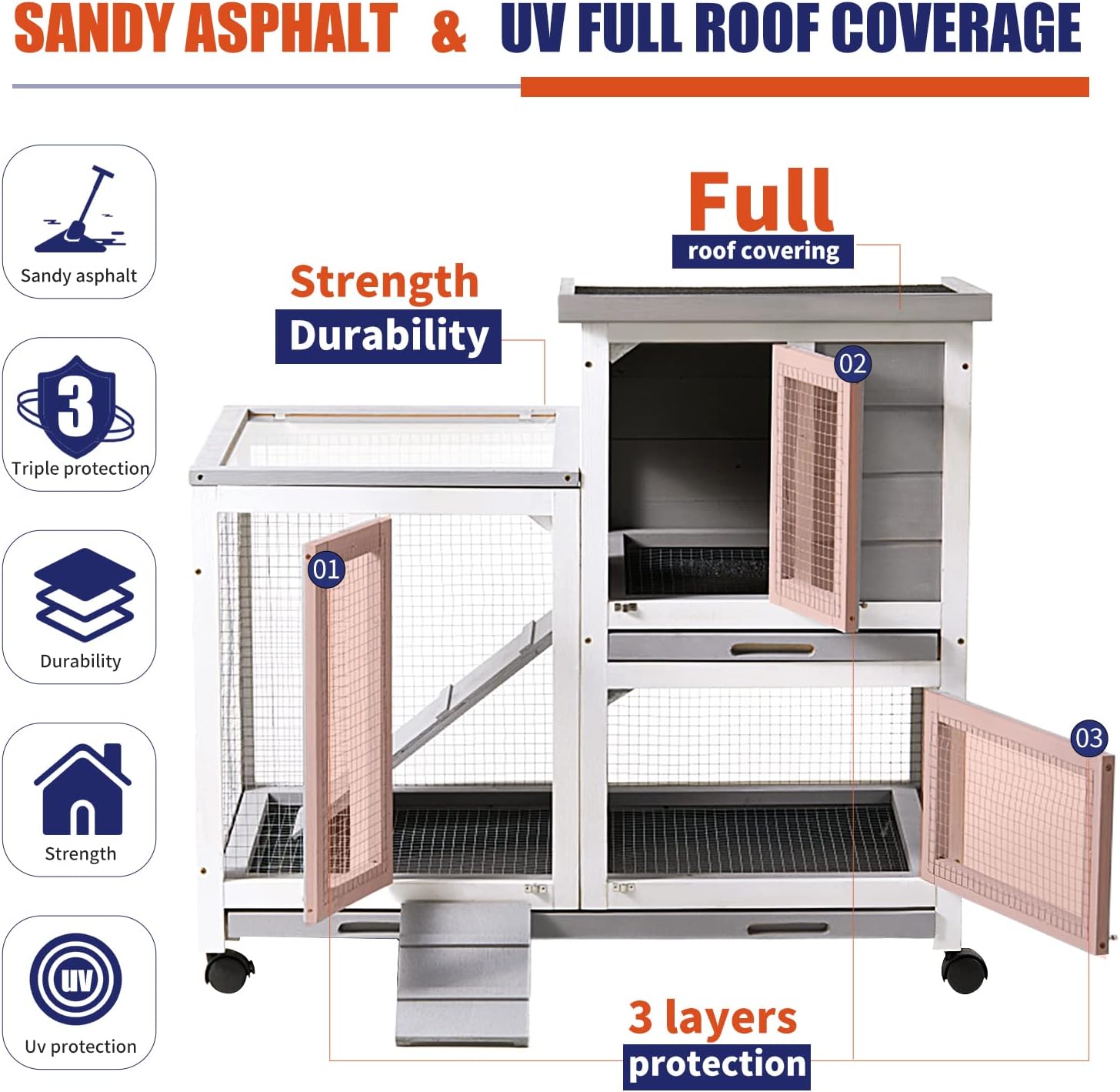 - Reasonable space planning -- The rabbit hutch comes with a raised nest box and a spacious resting box so your pet can play and roam freely. Designed with a ramp, pets can easily access the upper and lower areas of the living space. The rabbit hutch has a removable pull-out tray ! No leaks, better quality plastic, easy to clean ! In addition, you can watch your poultry friends without disturbing the outside of the coop.