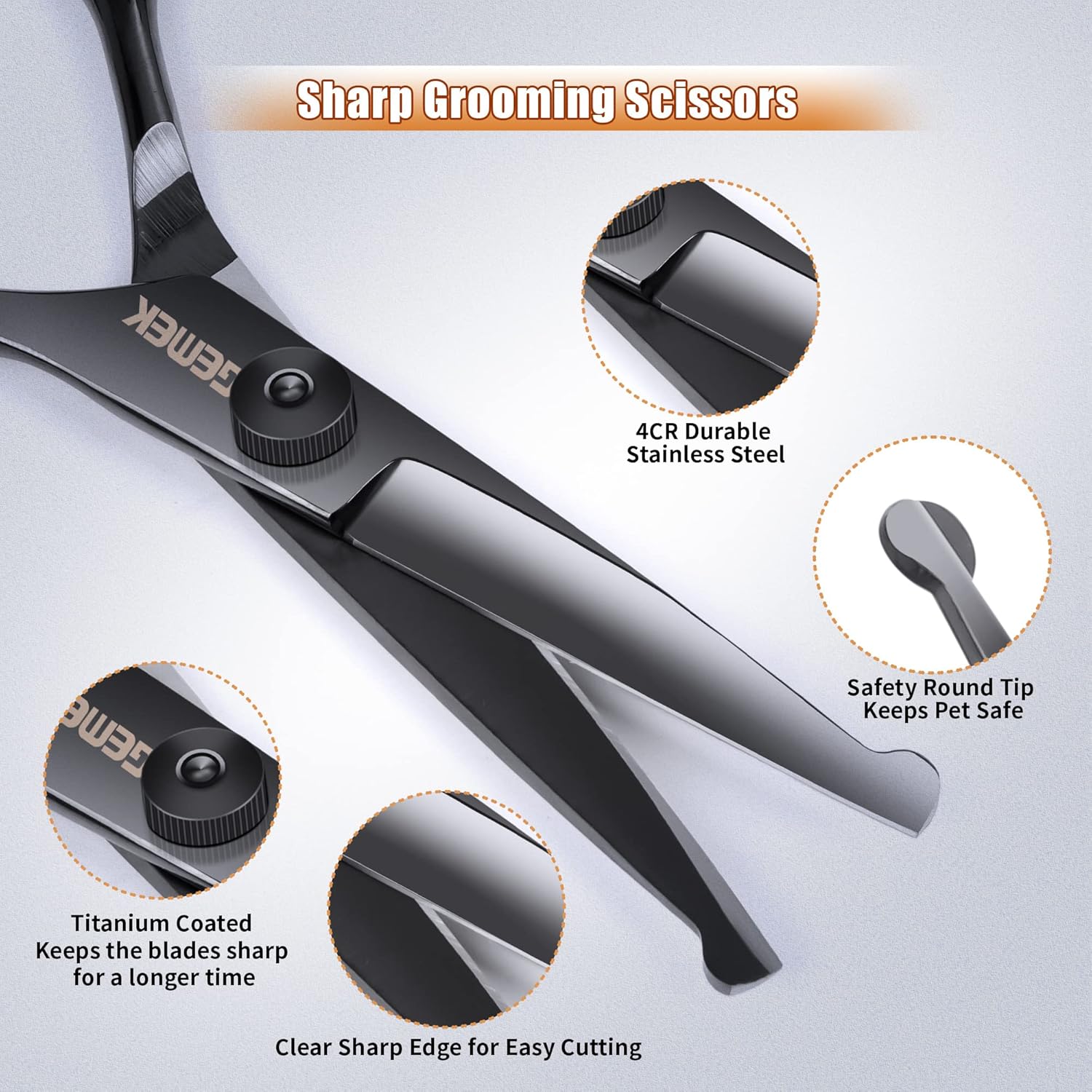 Dog Grooming Scissors Kit with Safety Round Tips, GEMEK Professional 6 in 1 Grooming Scissors for Dogs, Heavy Duty Titanium Coated Pet Grooming Scissor for Dogs, Cats and Other Animals (Black)