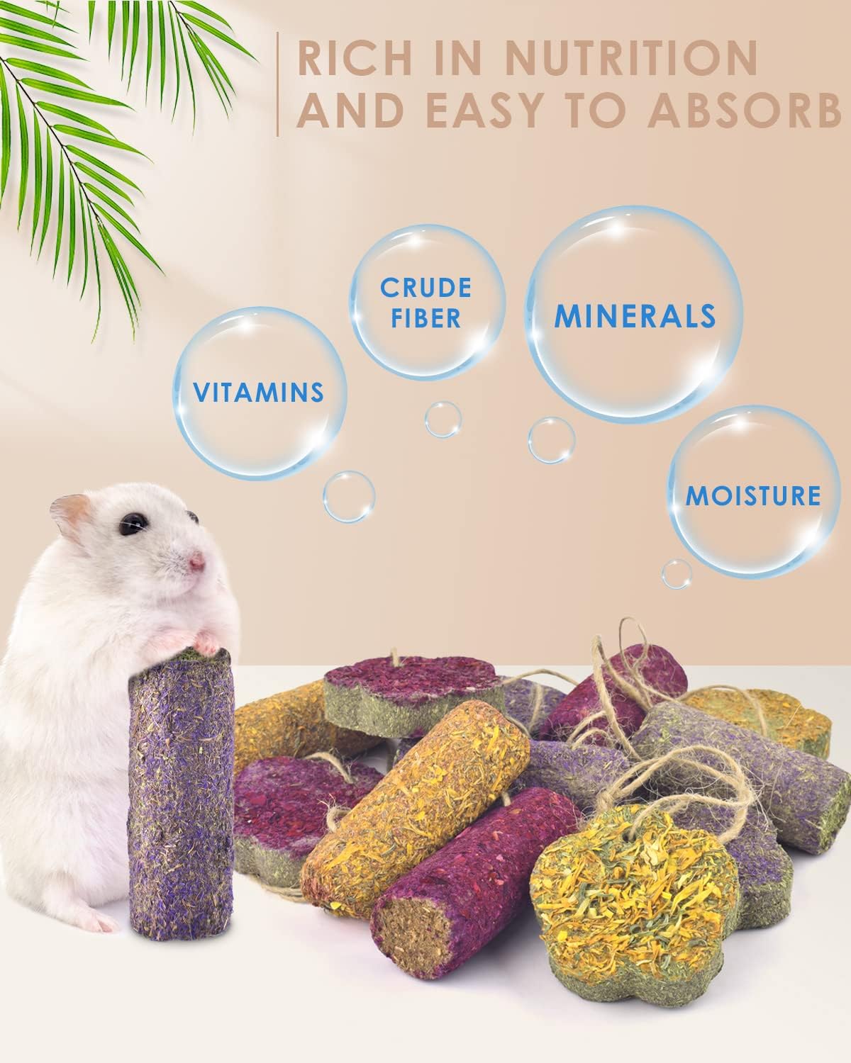 • Natural Molar Snacks: Rabbit chews are made of high quality timothy hay, carrot and strawberry, without any added pigment material, glue,additives. They are rich in plant fiber and nutrients that help pets improve digestion, increase their appetite, which ensure the health of small animals growing up