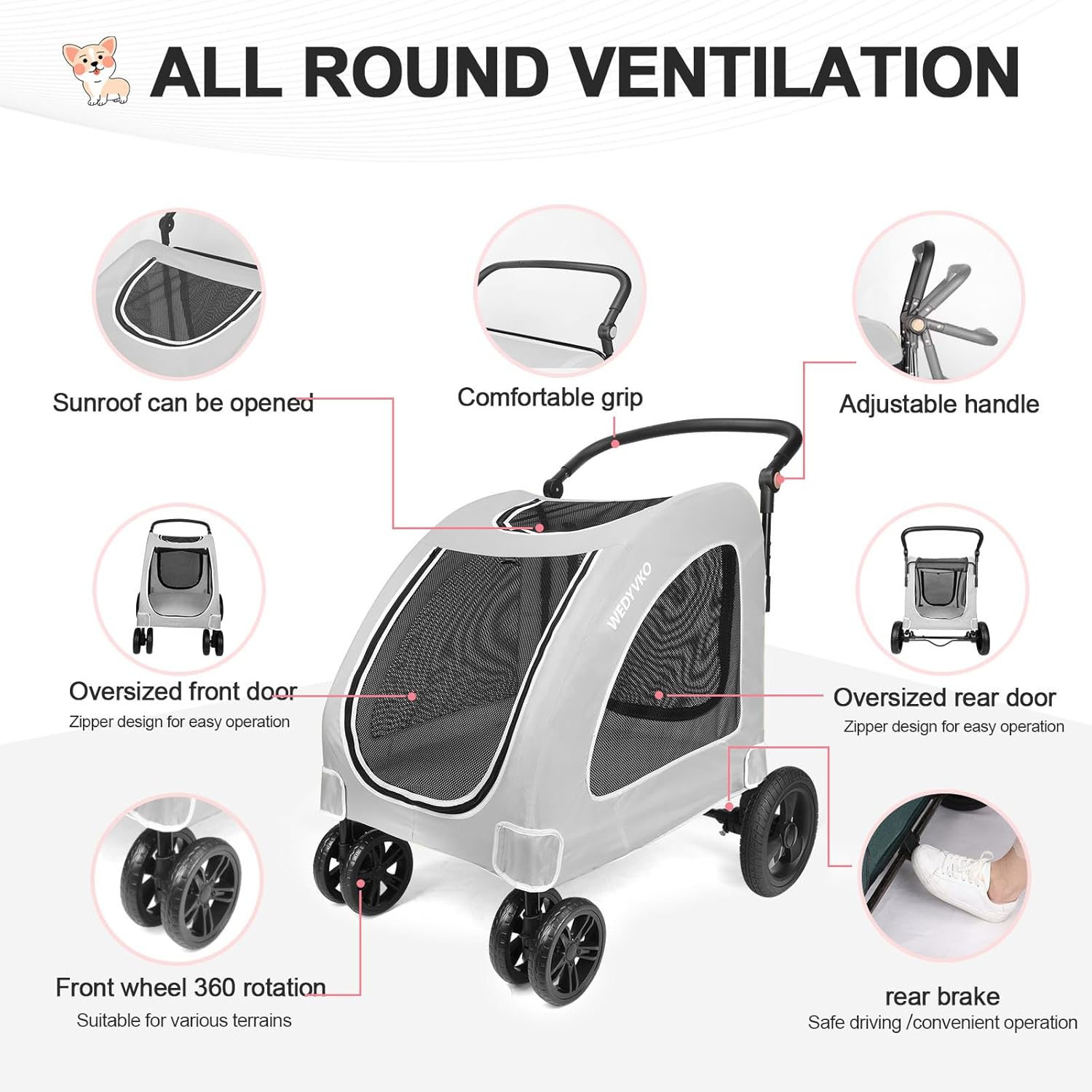 Large Dog Travel Stroller with 4 Heavy Duty Wheels Pet Stroller with Adjustable Handle - Double Doggie Capacity Jogger Wagon with Back Front Door for Small Medium Large Dogs (Grey)