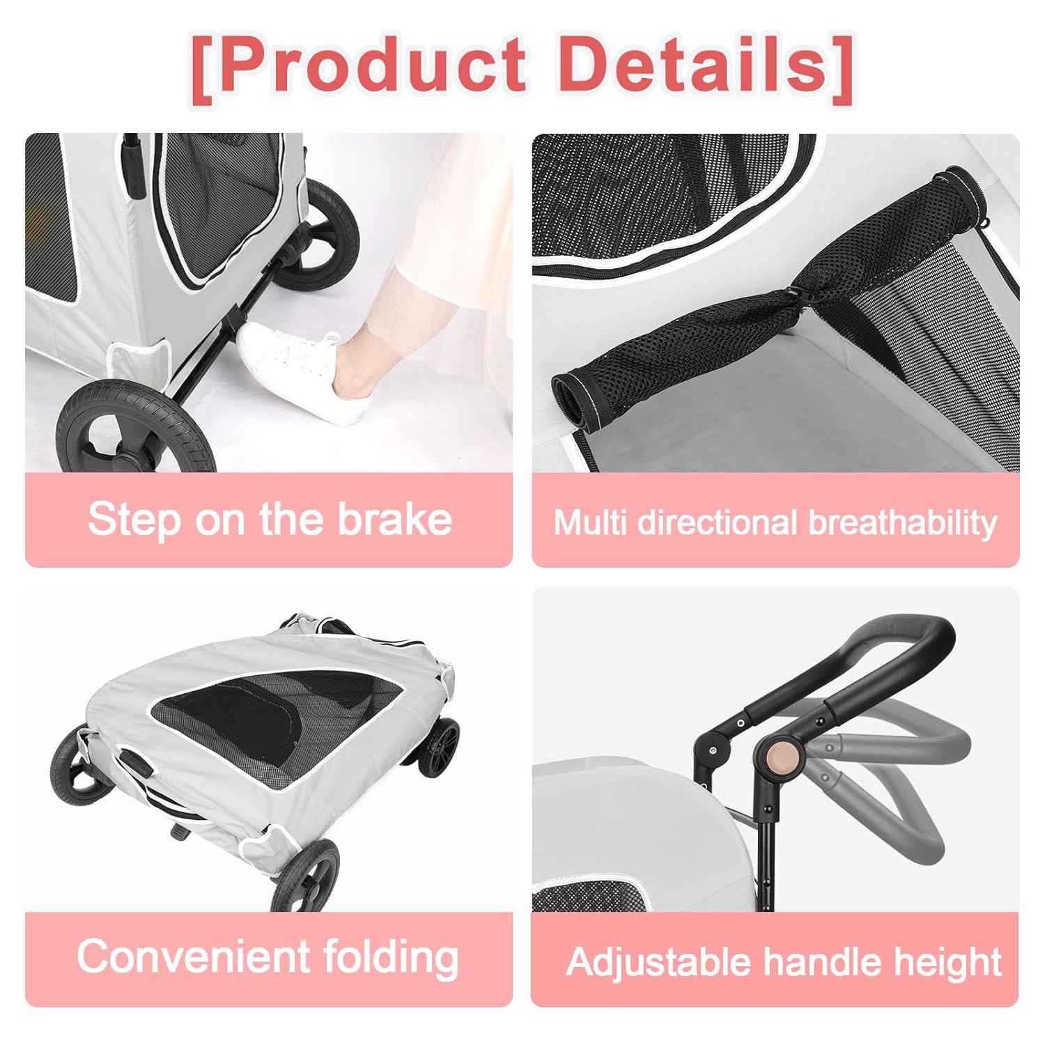 - 【Safe & Stable Design】Our big dog stroller is equipped with an 11-inch rear wheel, a locking system, and a 7-inch 360 ° rotation front double wheel, which allows you to easily pass through various terrain. The big wheels of our dog car can absorb shock and vibration, improve the comfort of pets, and are suitable for injured or elderly dogs.