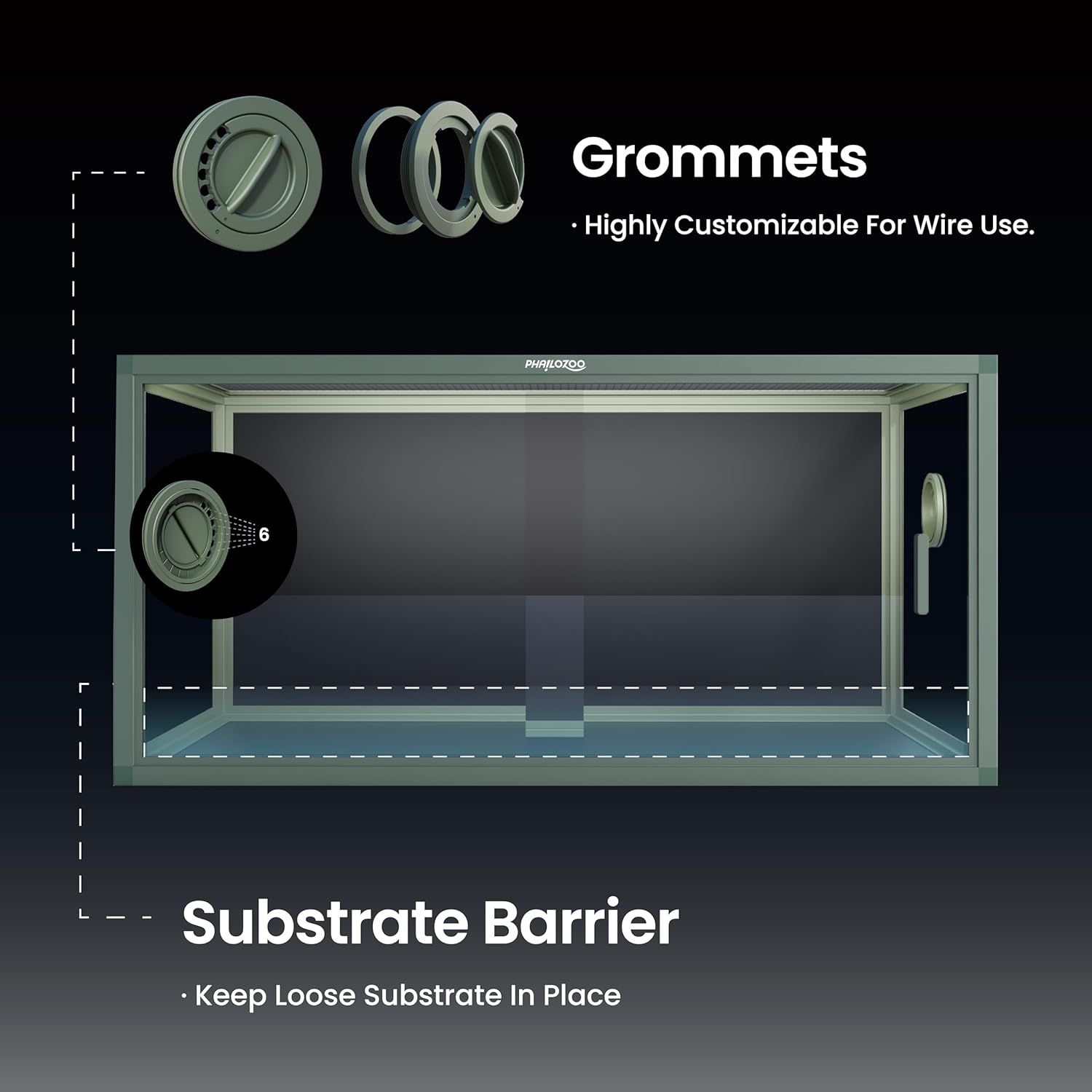 - ăEasy MaintenanceăFront opening reptile terrarium with door handles included for easy cleaning & feeding. No more suction cup problems or unsightly fingerprints all over. The substrate barrier keeps the substrate in place. Our tempered glass doors are durable enough to withstand scratching.