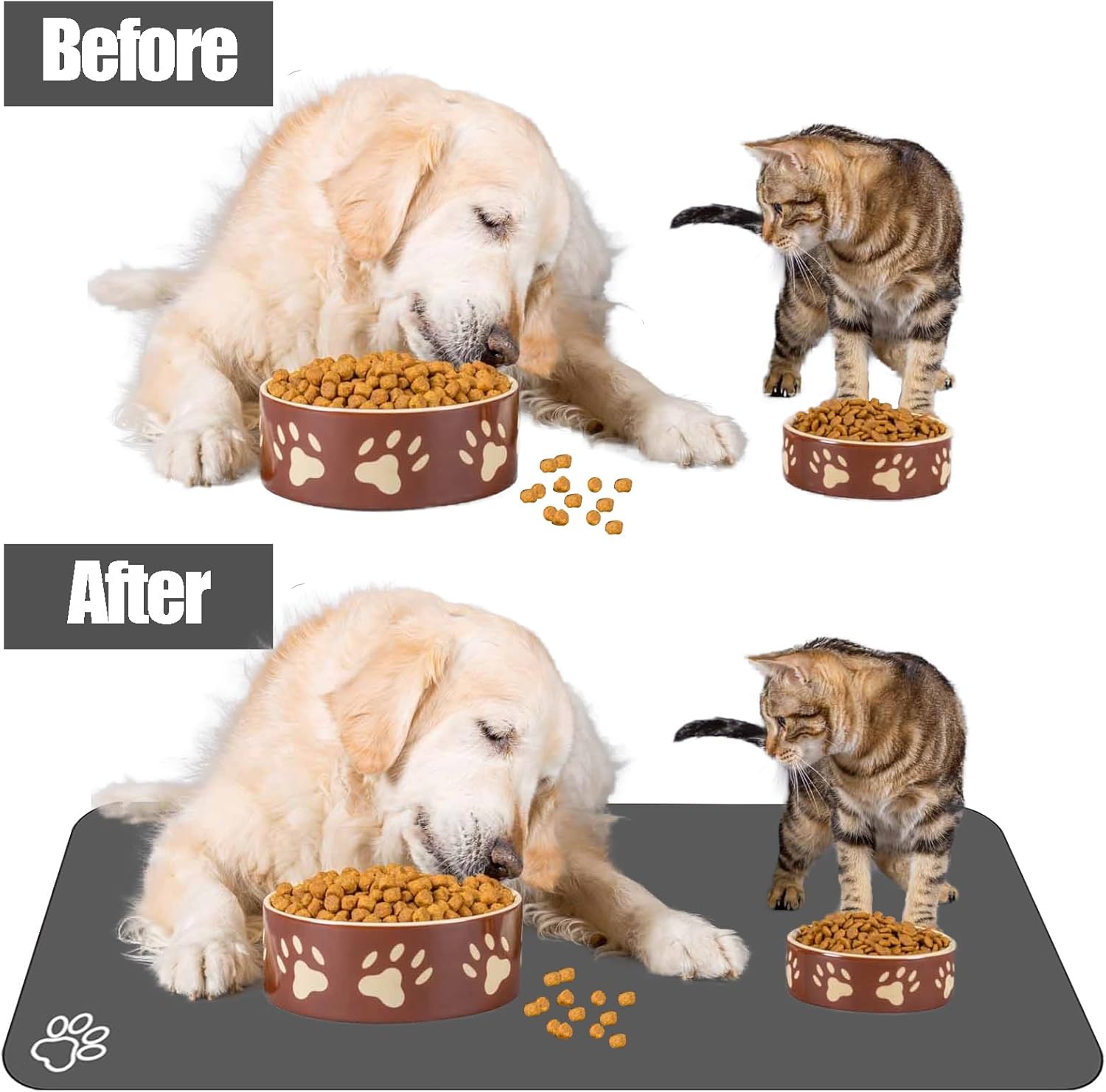 - Pet Supplies & Applicable: This dog feeding mat suits dog cat puppy or other pets. Plenty of room for two bowls. Use it under the automatic feeder or raised feeder will be perfect too. Great drying mat for for dog food and water bowls. Let your beloved pet have a whole set of exclusive pet supplies.