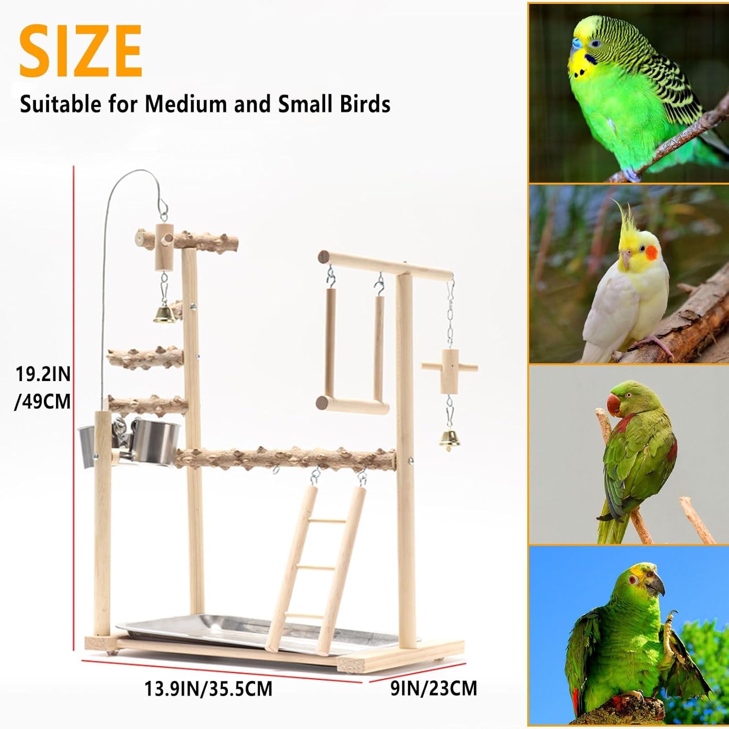 Bird Playground Parrot Playstand Bird Perch Stand Gym Natural Wood Play Stand with Swing Ladder Feeder Cups for Parakeets Cockatiels Lovebirds Conures Budgies